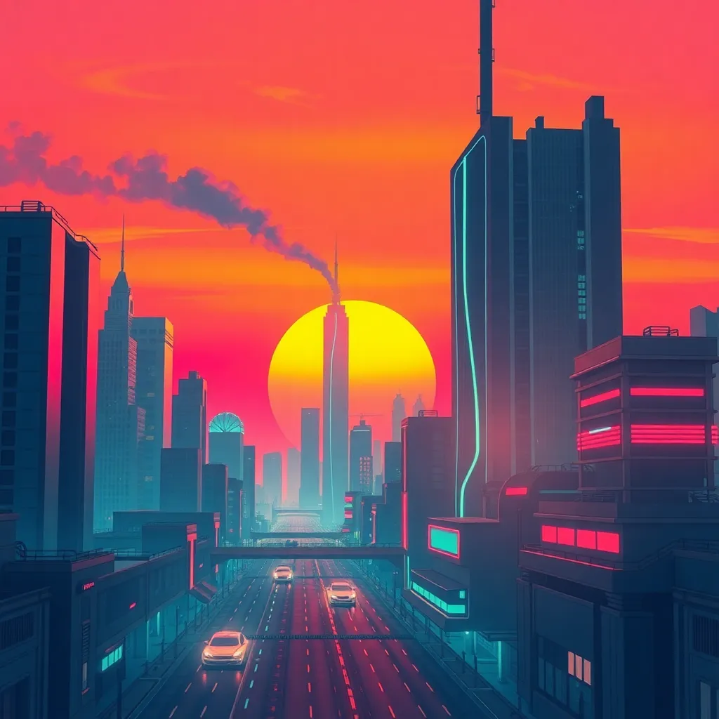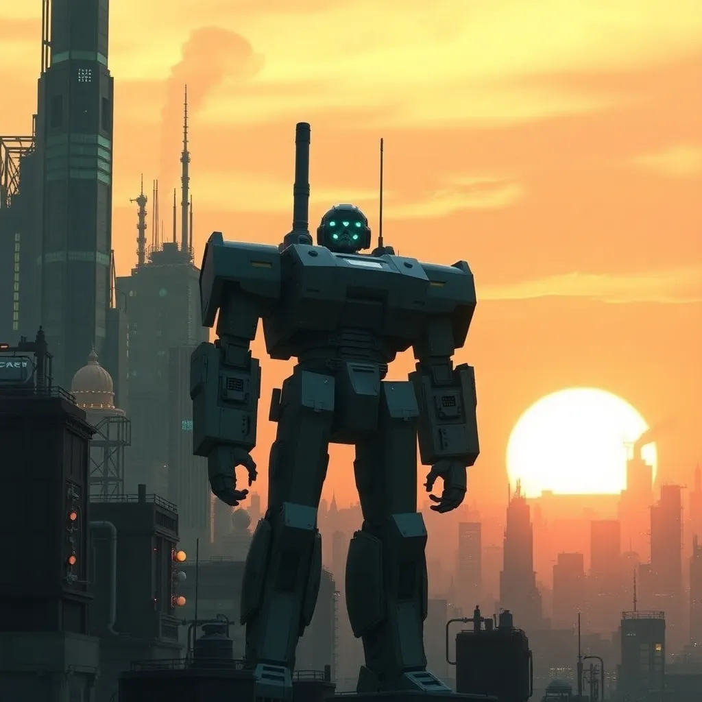 Create a futuristic cityscape at sunset with a giant robot standing tall in the foreground, surrounded by a sprawling metropolis with neon-lit skyscrapers and a vibrant orange-yellow sky. Incorporate subtle hints of smoke and steam rising from the city's machinery, with a sense of nostalgia and wonder.