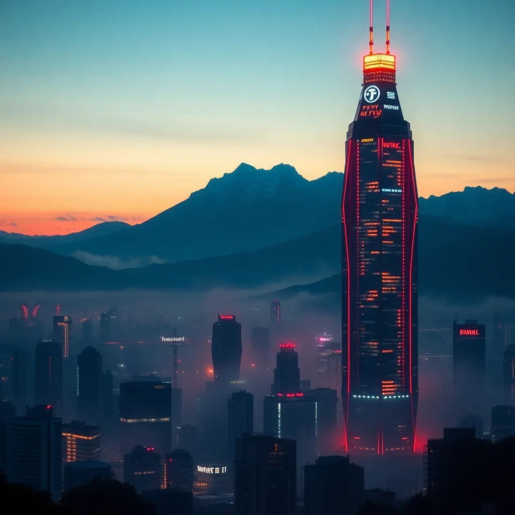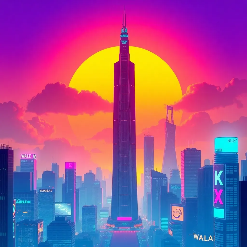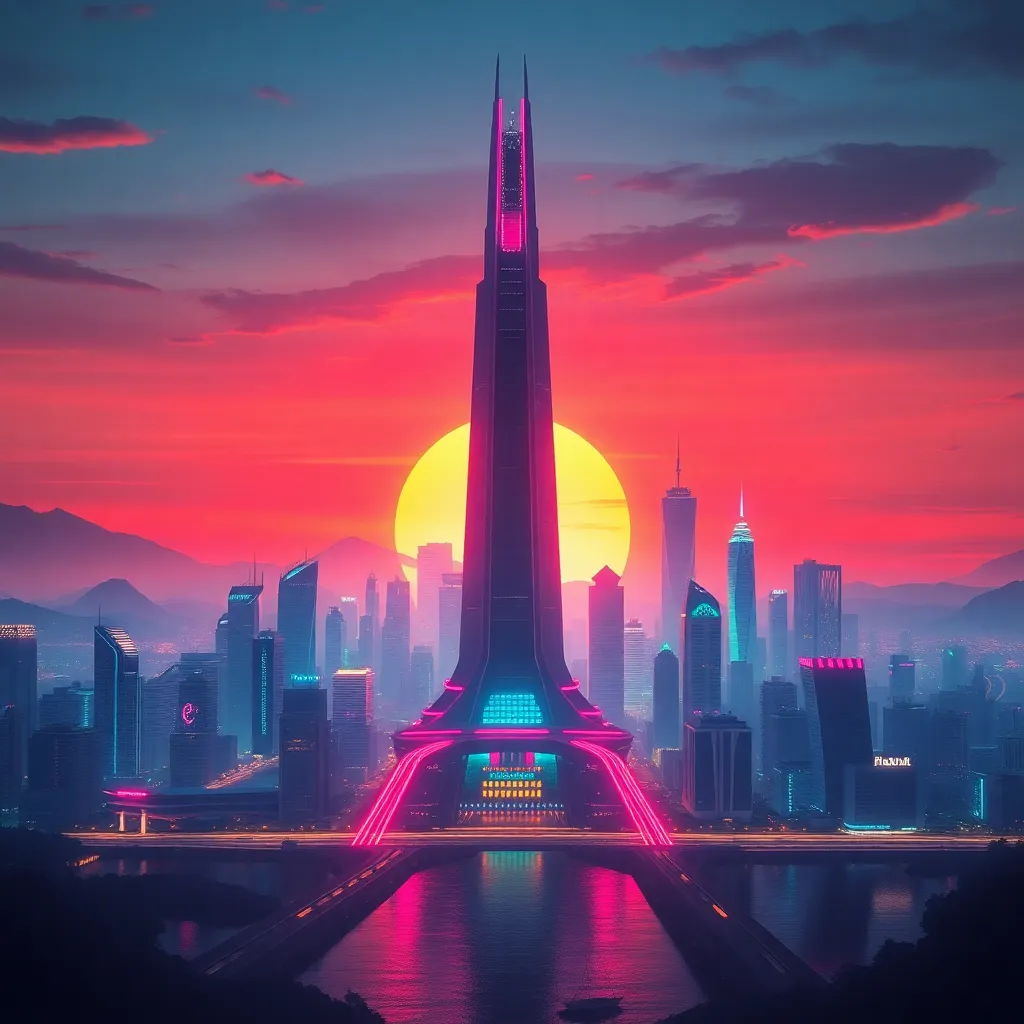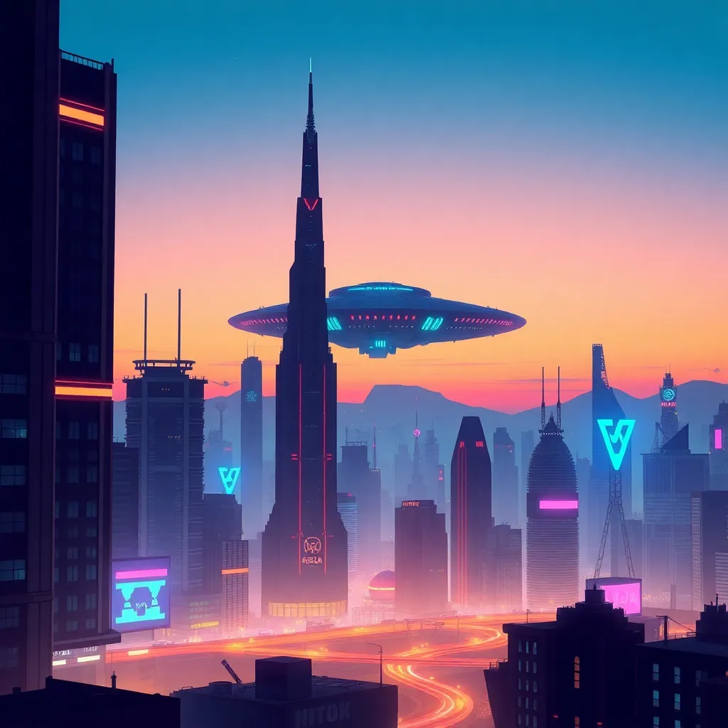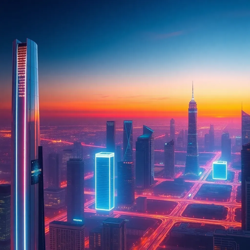 Create a futuristic cityscape at sunset with a sleek, silver skyscraper in the foreground and a vibrant, neon-lit cityscape in the background. Incorporate subtle, glowing lines to represent the city's technology and energy. Use a warm color palette with a mix of cool blues and oranges for a futuristic feel.