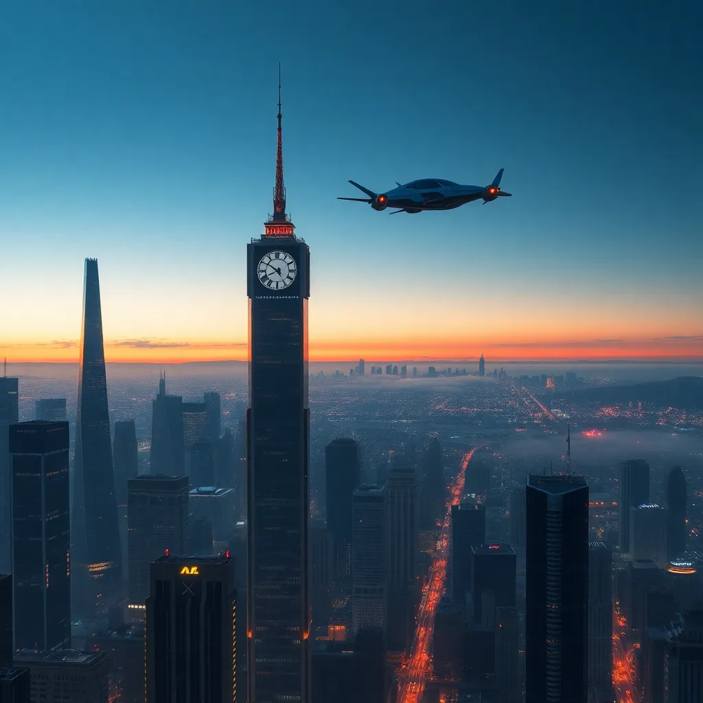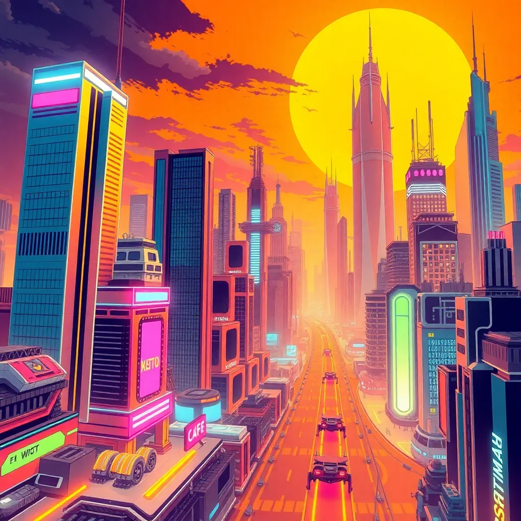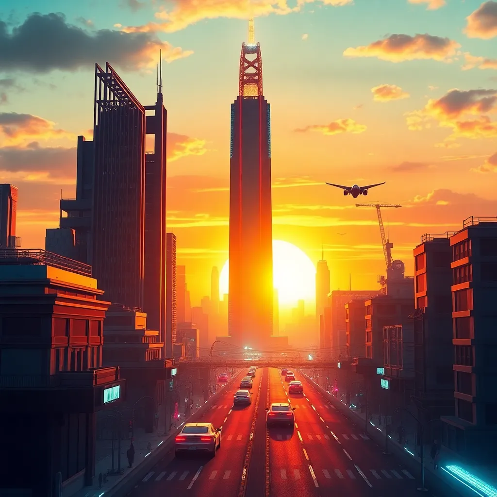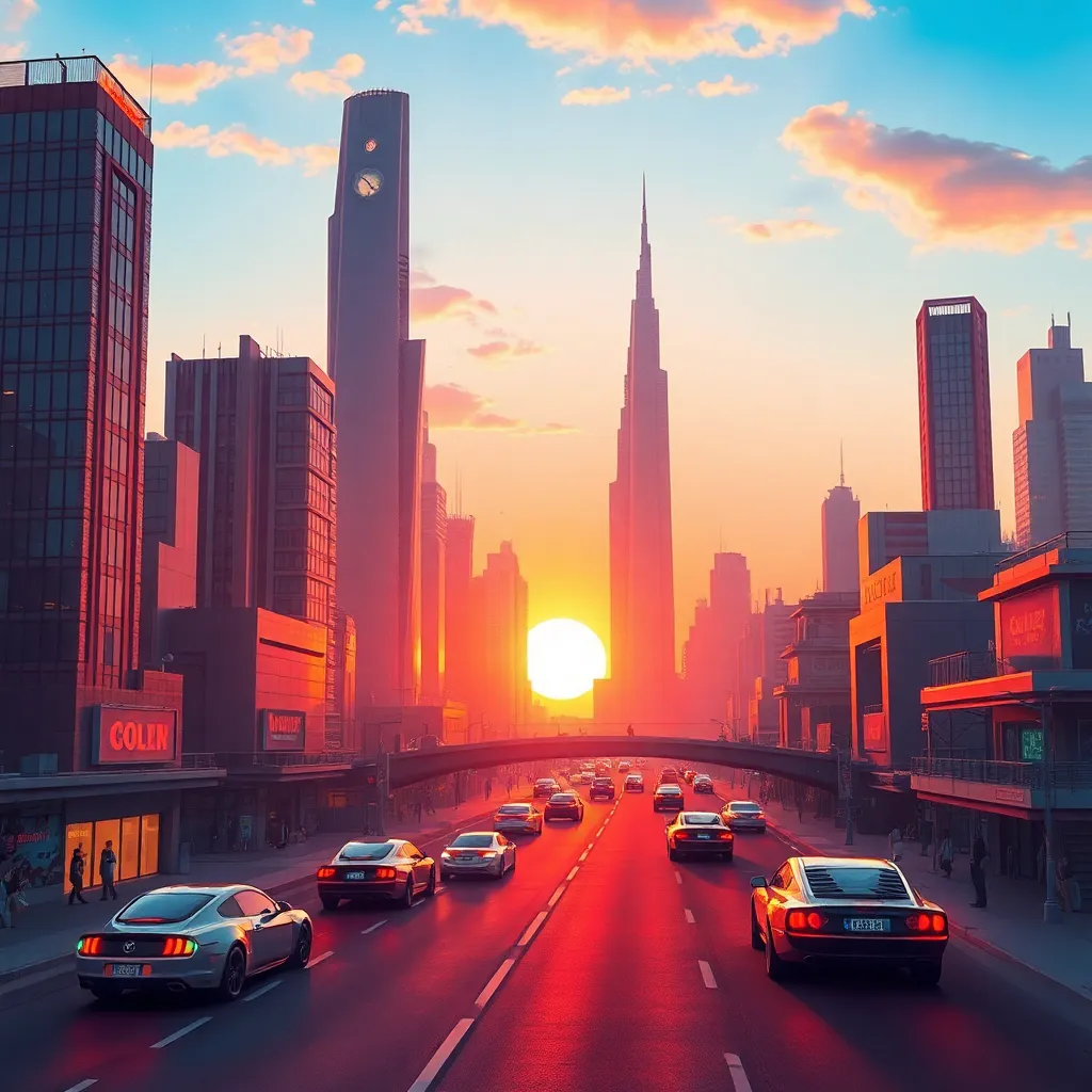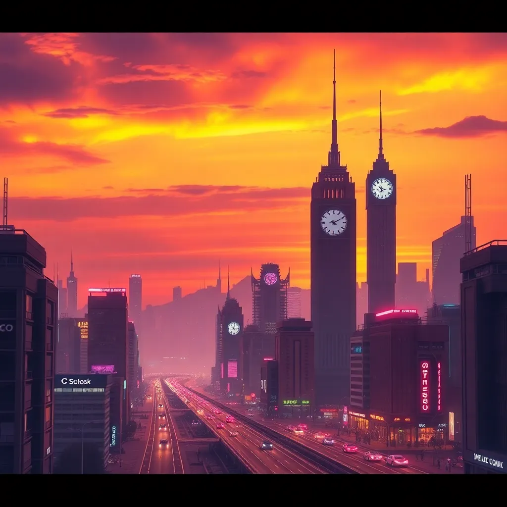 Create a futuristic cityscape at sunset. The sky should be a warm orange with purple hues. The city should be bustling with tall skyscrapers and flying cars zipping by. Incorporate neon lights and a prominent clock tower. The atmosphere should be vibrant and energetic, with a sense of innovation and progress.