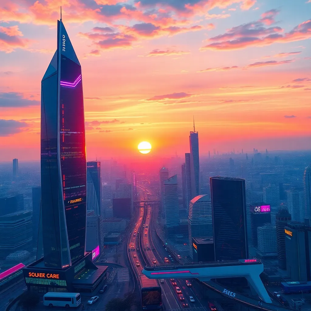 Create a futuristic cityscape at sunset with a sleek, high-tech skyscraper in the foreground and a sprawling metropolis in the background. Incorporate vibrant colors, neon lights, and a sense of movement. The city should be bustling with life, with cars, buses, and pedestrians moving through the scene.