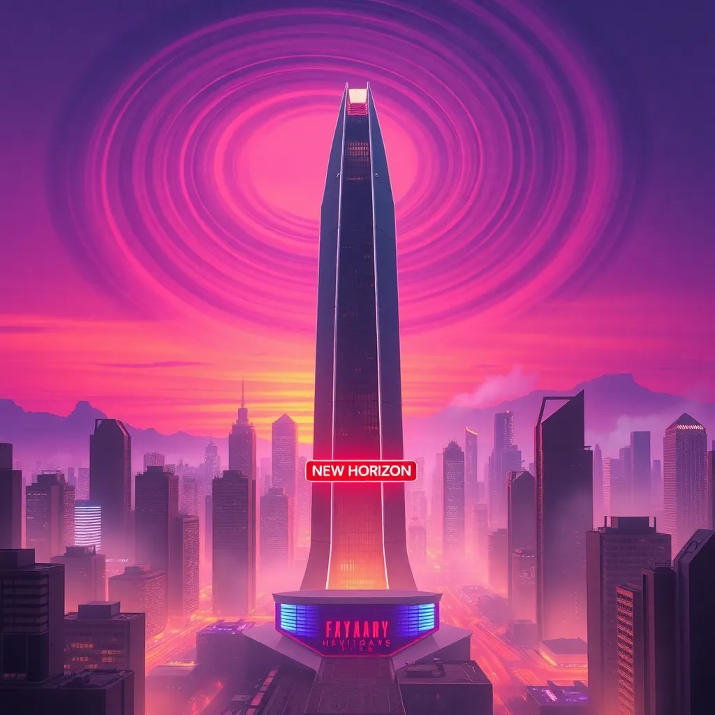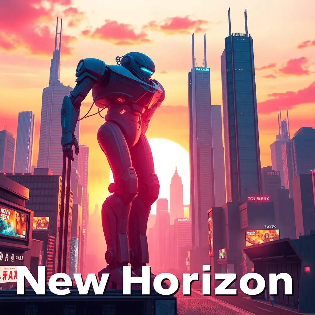 Create a futuristic cityscape at sunset with a giant robot in the foreground, surrounded by towering skyscrapers and a vibrant orange-pink sky. Incorporate neon lights and holographic advertisements to give the scene a dynamic, high-tech feel. Use a bold, futuristic font to add the text 'New Horizon' in the bottom left corner.