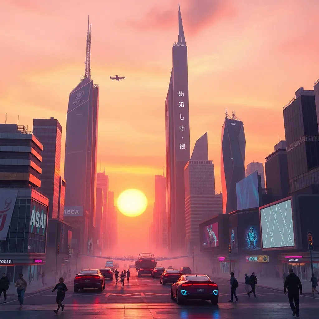 Create a stunning futuristic cityscape at sunset, with sleek skyscrapers, flying cars, and a vibrant orange-pink sky. Incorporate neon lights and holographic advertisements, with a subtle misty atmosphere. The city should be bustling with activity, with people walking, jogging, or riding hoverboards.