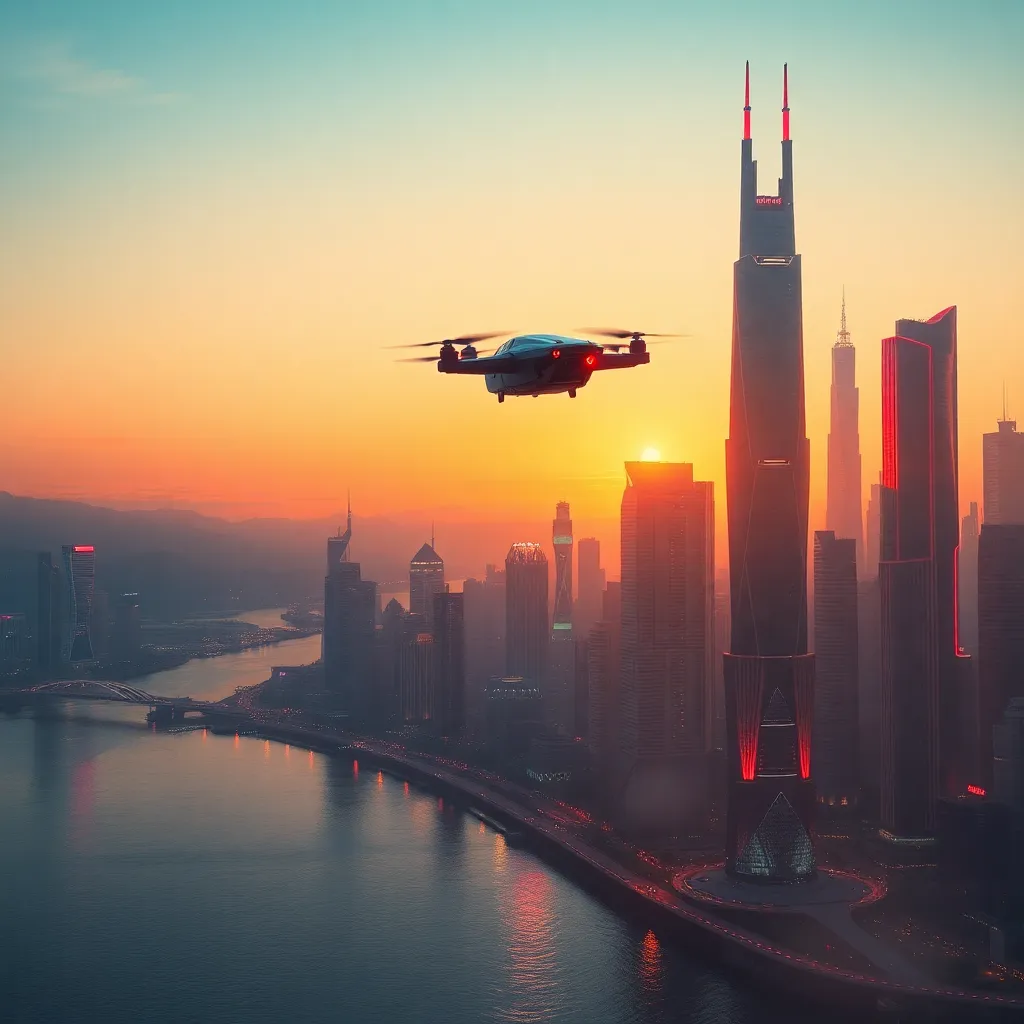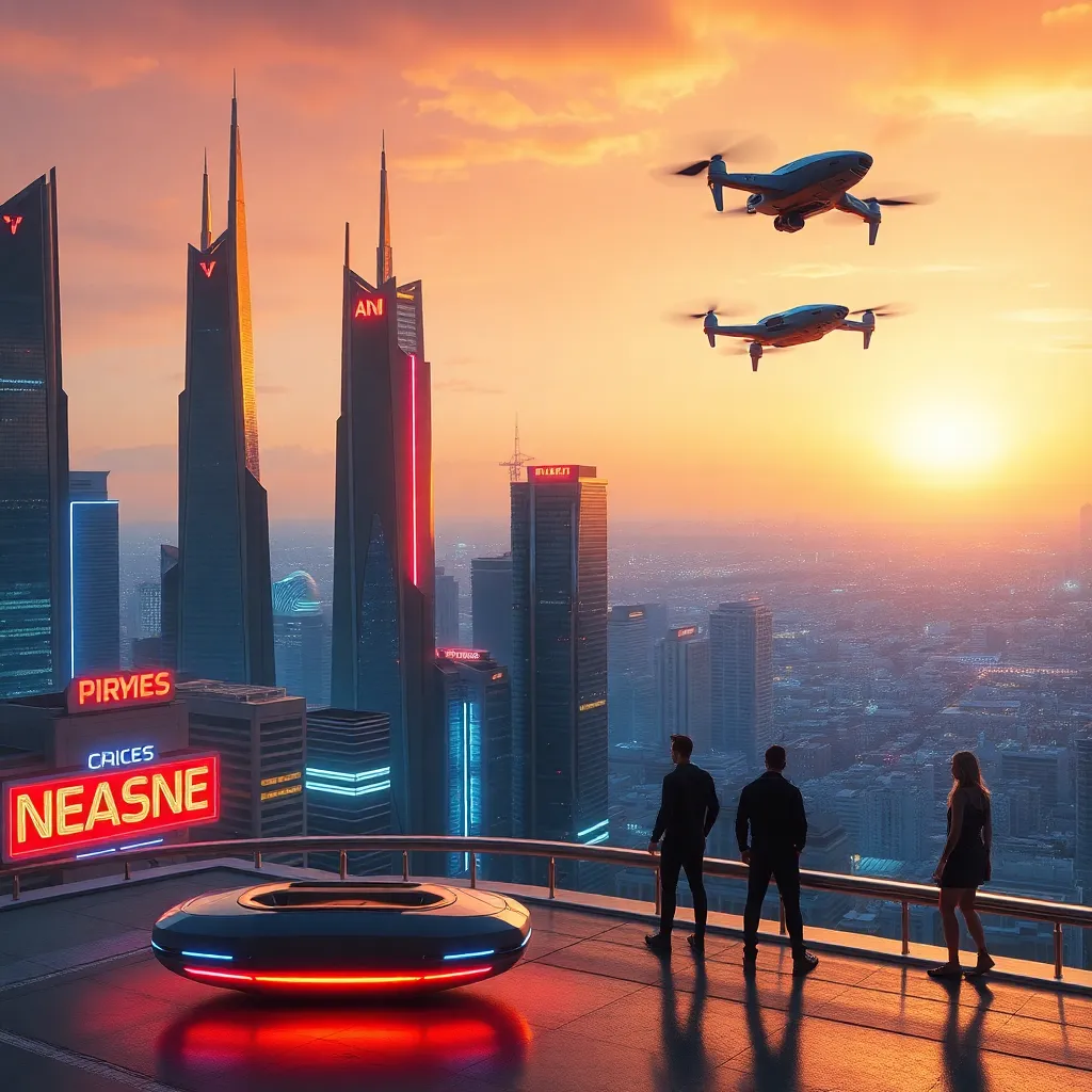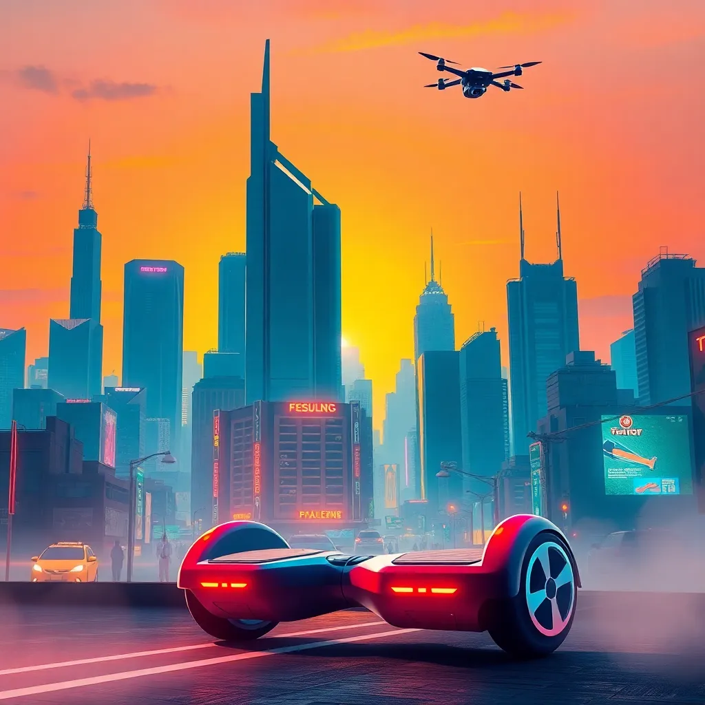 Create a futuristic cityscape at sunset, with sleek skyscrapers, neon lights, and a sprawling metropolis in the background. Incorporate a hovering drone, a speeding hoverboard, and a group of people in futuristic attire, all bathed in a warm, golden light. Add a sense of movement and energy to the scene.