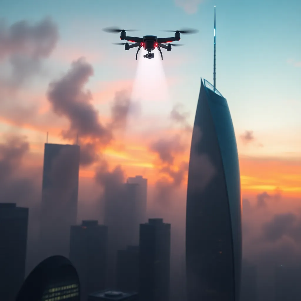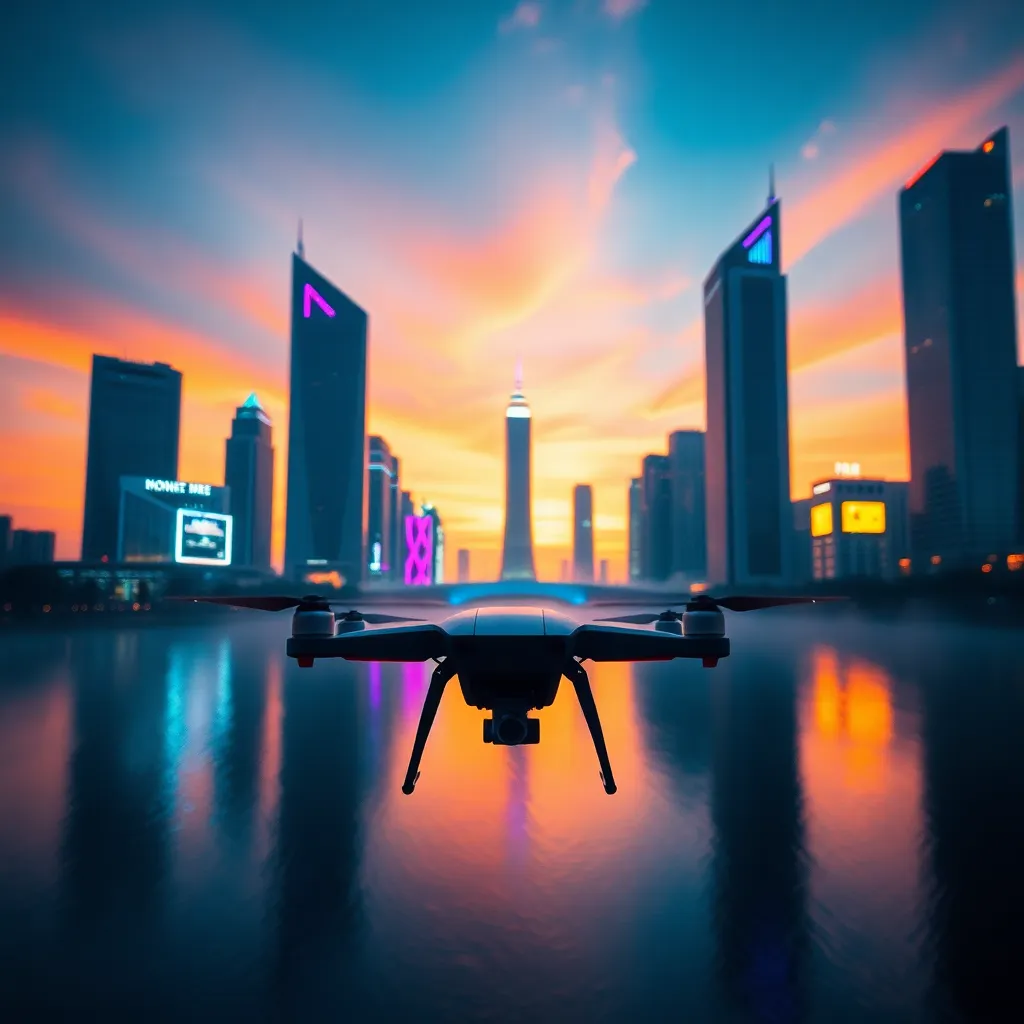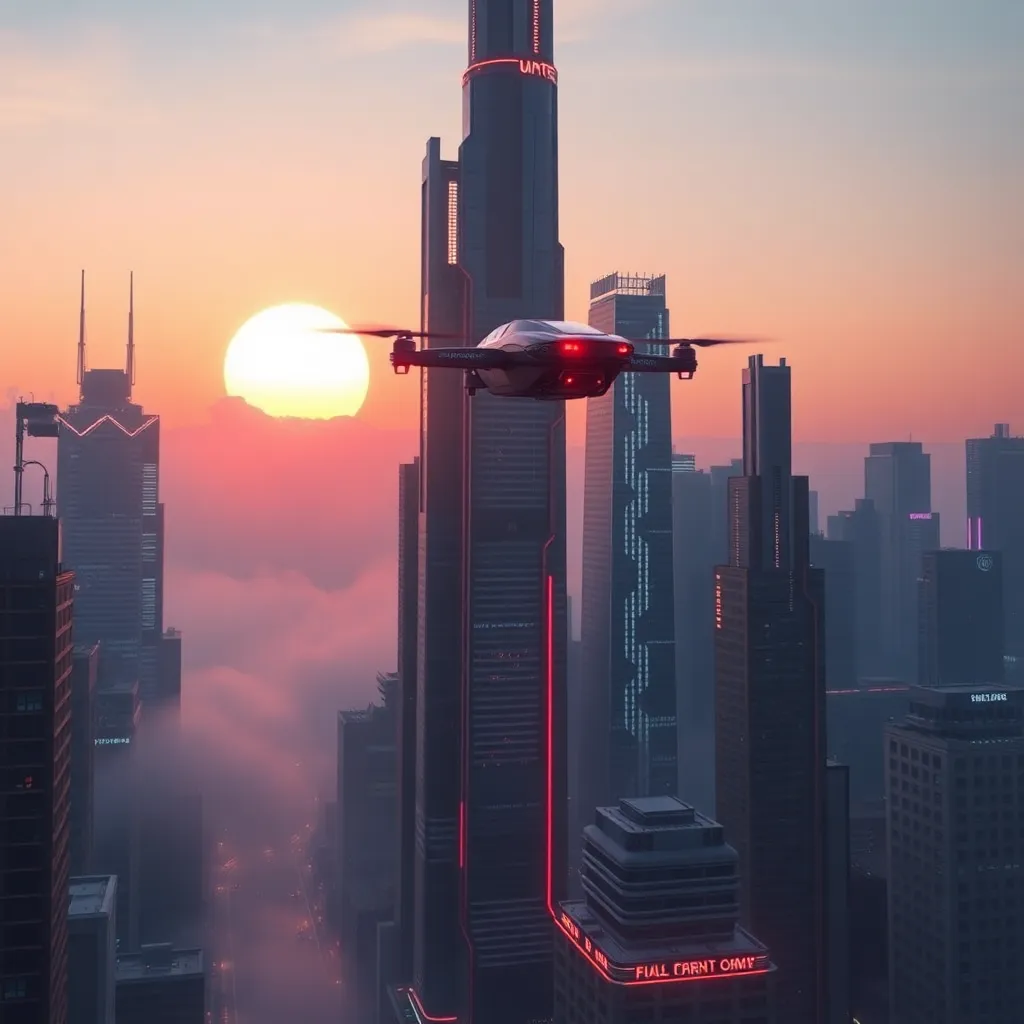Create a futuristic cityscape at sunset, with sleek skyscrapers, neon lights, and a sprawling metropolis in the background. Incorporate a hovering drone, a speeding hoverboard, and a group of people in futuristic attire, all bathed in a warm, golden light. Add a sense of movement and energy to the scene.