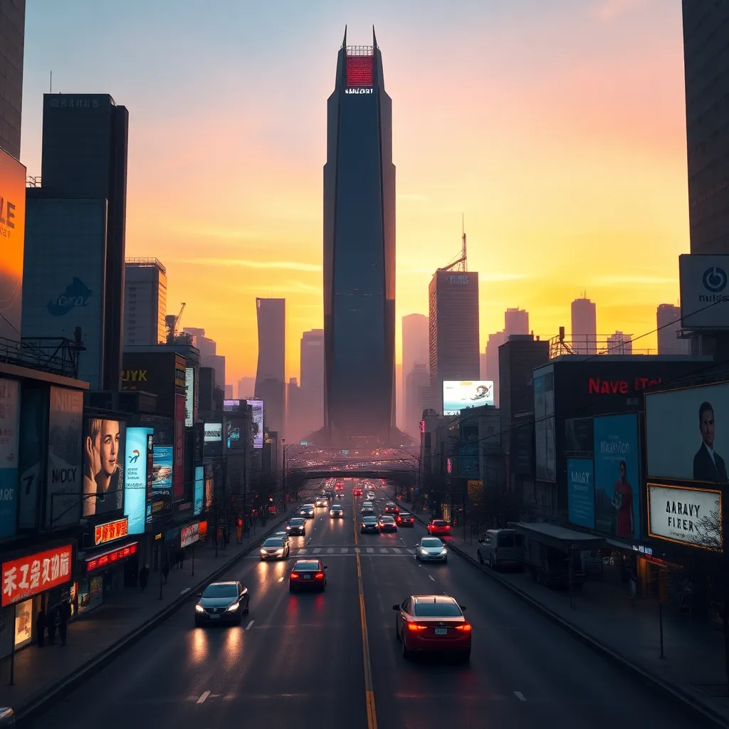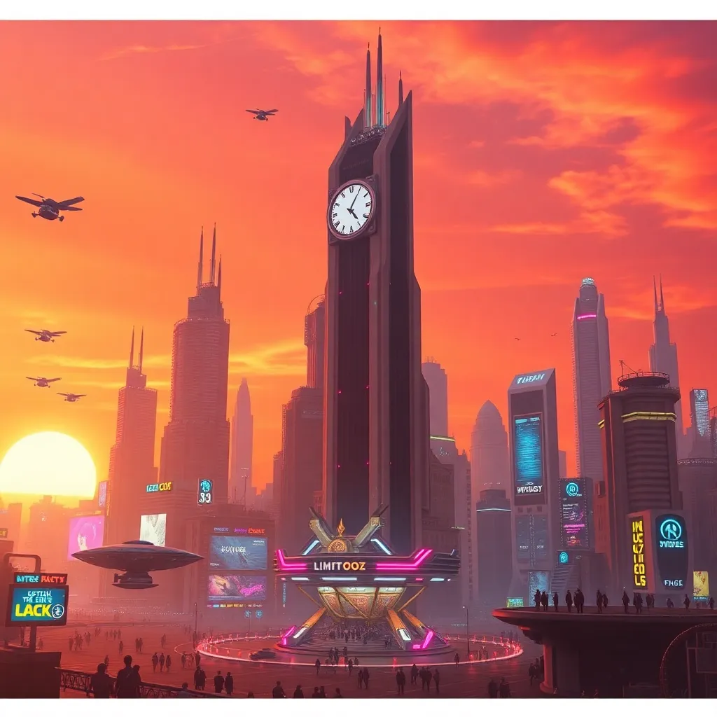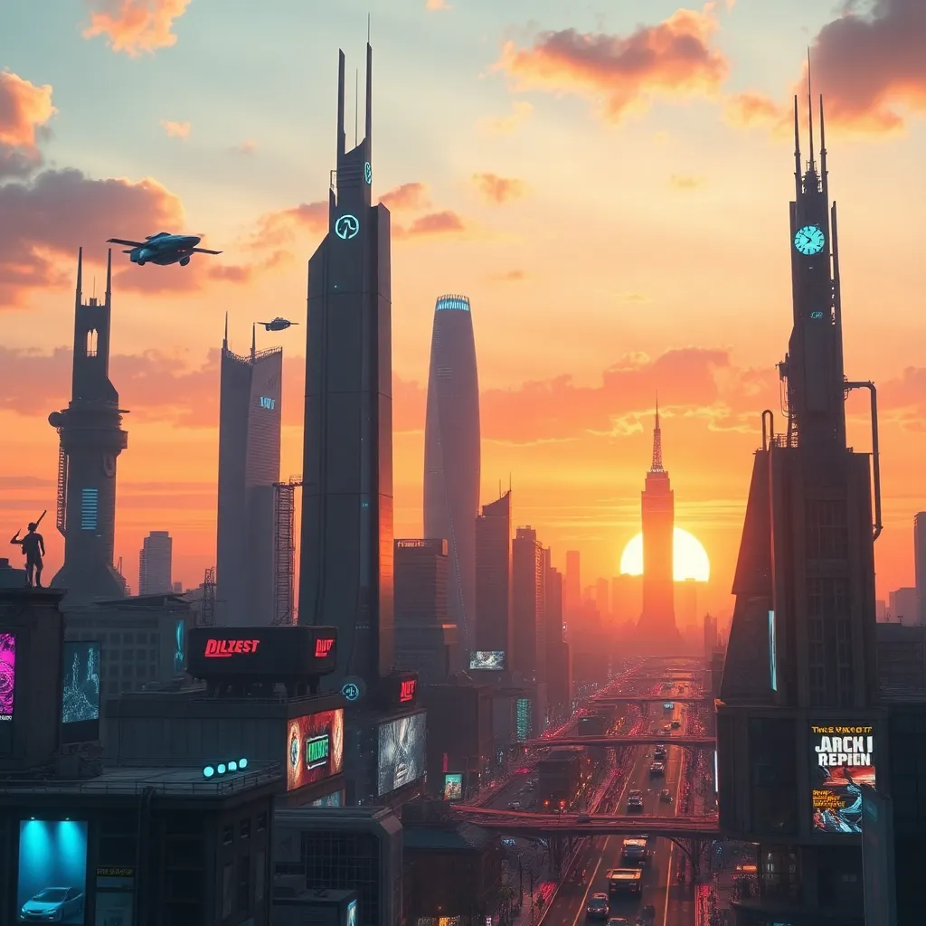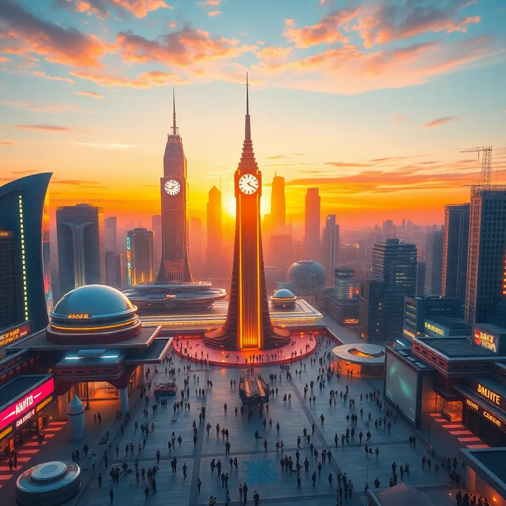 Create an image of a futuristic cityscape at sunset, with sleek skyscrapers, flying cars, and a vibrant neon-lit atmosphere. Incorporate a prominent clock tower and a sprawling city square with people enjoying the evening. The image should have a warm, golden glow and a sense of optimism and innovation.