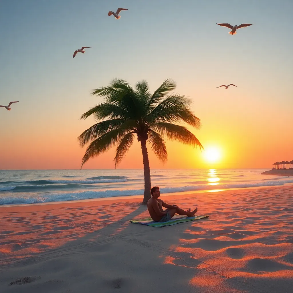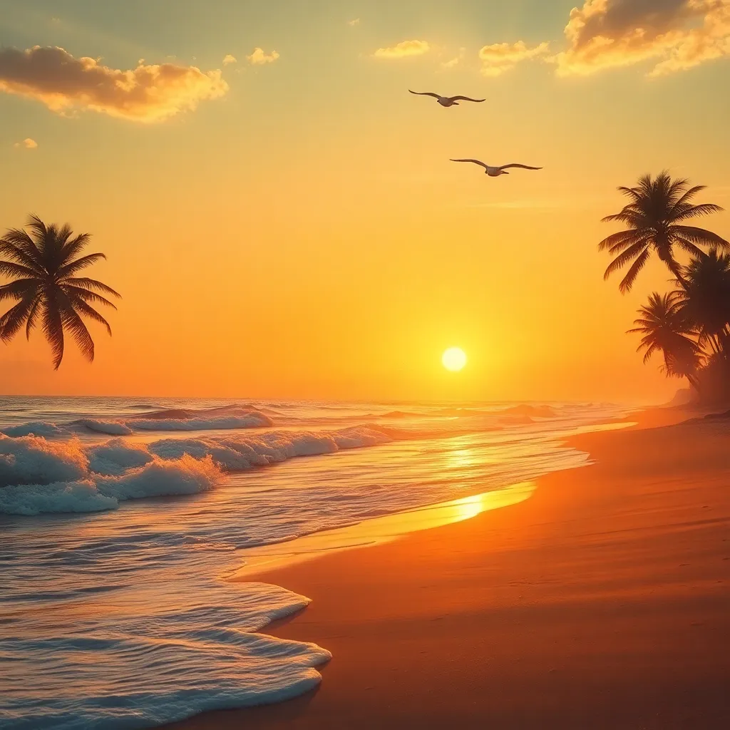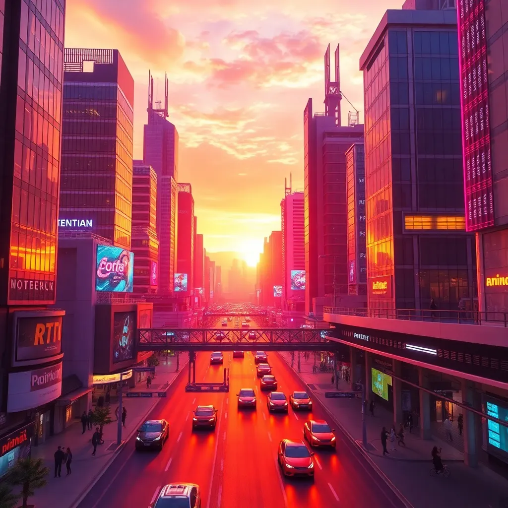 Create a futuristic cityscape at sunset, with sleek skyscrapers, flying cars zipping by, and a vibrant neon-lit city square. Incorporate a sense of movement and energy, with a warm orange and pink hue dominating the scene. The city should be bustling with activity, yet still convey a sense of tranquility.
