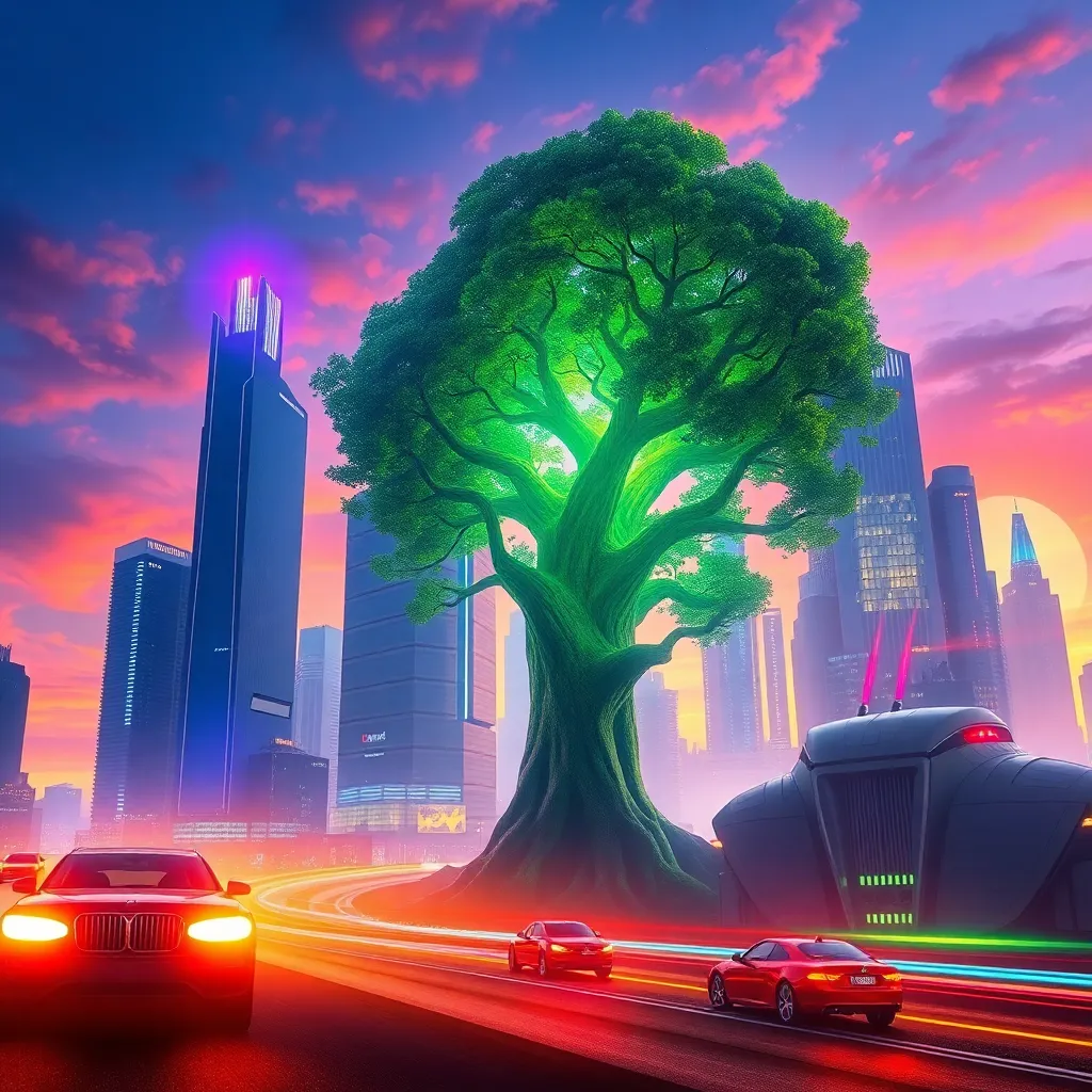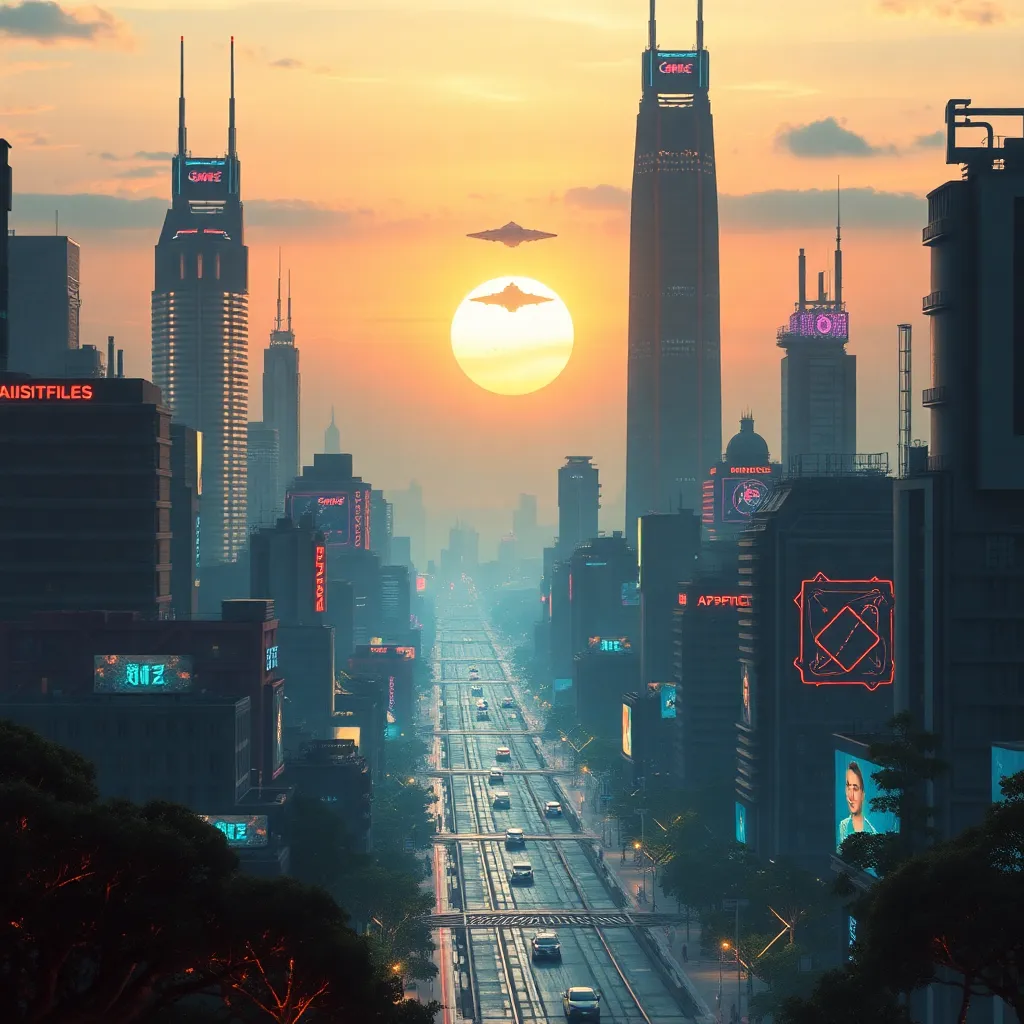 Create a futuristic cityscape at sunset with towering skyscrapers, neon lights, and a distant spaceship landing on the horizon. Incorporate a blend of organic and synthetic elements, such as glowing trees and holographic advertisements, to showcase a harmonious balance between nature and technology.