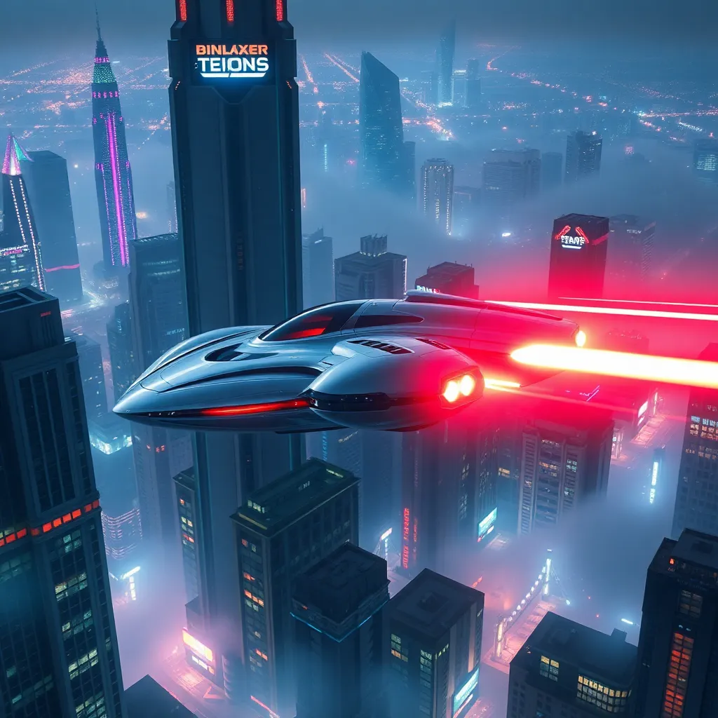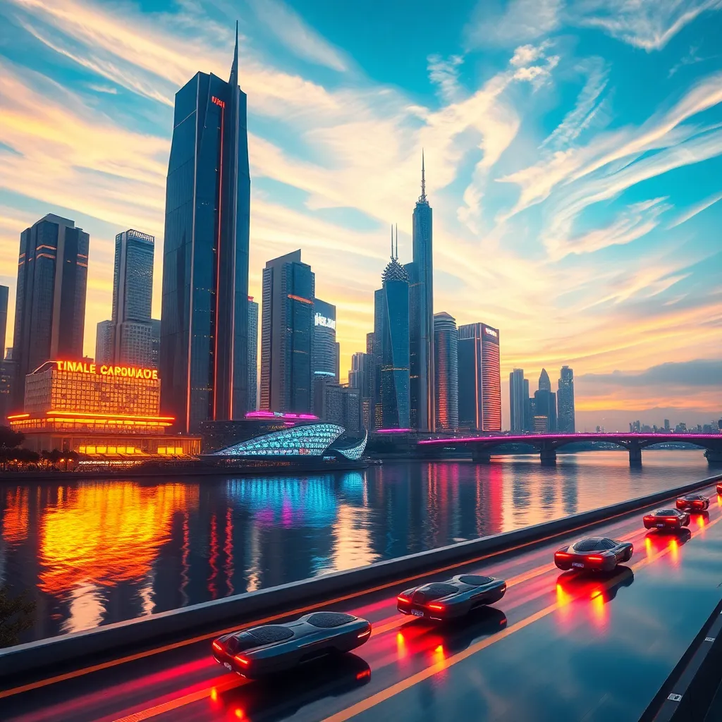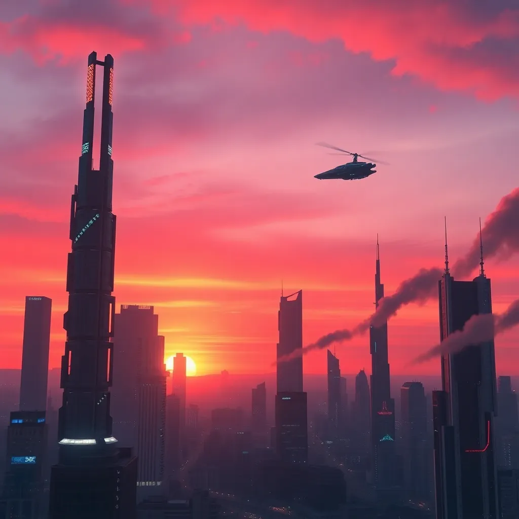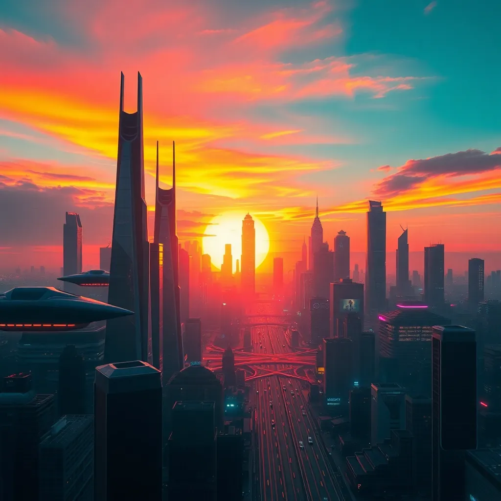 Create an image of a futuristic cityscape at sunset, with sleek skyscrapers, flying cars, and a vibrant neon-lit atmosphere. Incorporate a subtle sense of mystery and wonder, as if the city is hiding secrets beneath its gleaming surface. Use a bold color palette and dynamic composition to capture the viewer's attention.