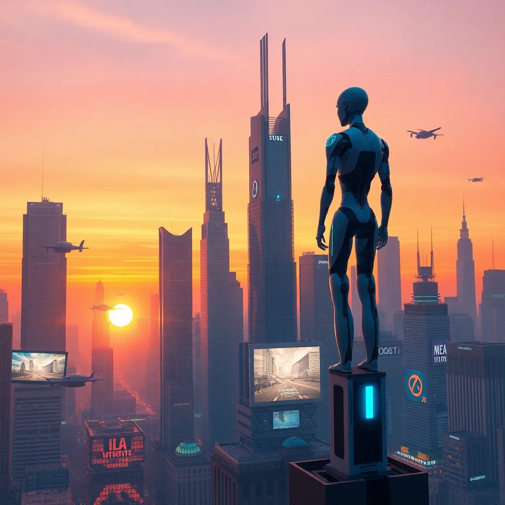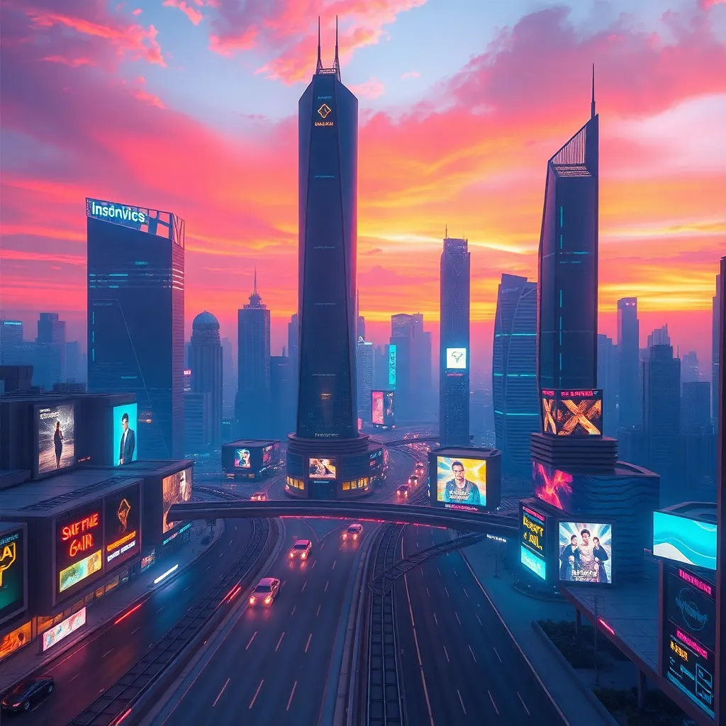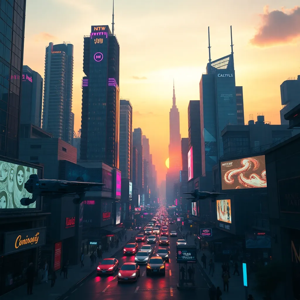 Create an image of a futuristic cityscape at sunset, with towering skyscrapers, flying cars zipping by, and a vibrant orange-pink sky. Incorporate neon lights and holographic advertisements, with a sense of bustling energy and innovation. The image should be visually stunning and evoke a sense of wonder and excitement.
