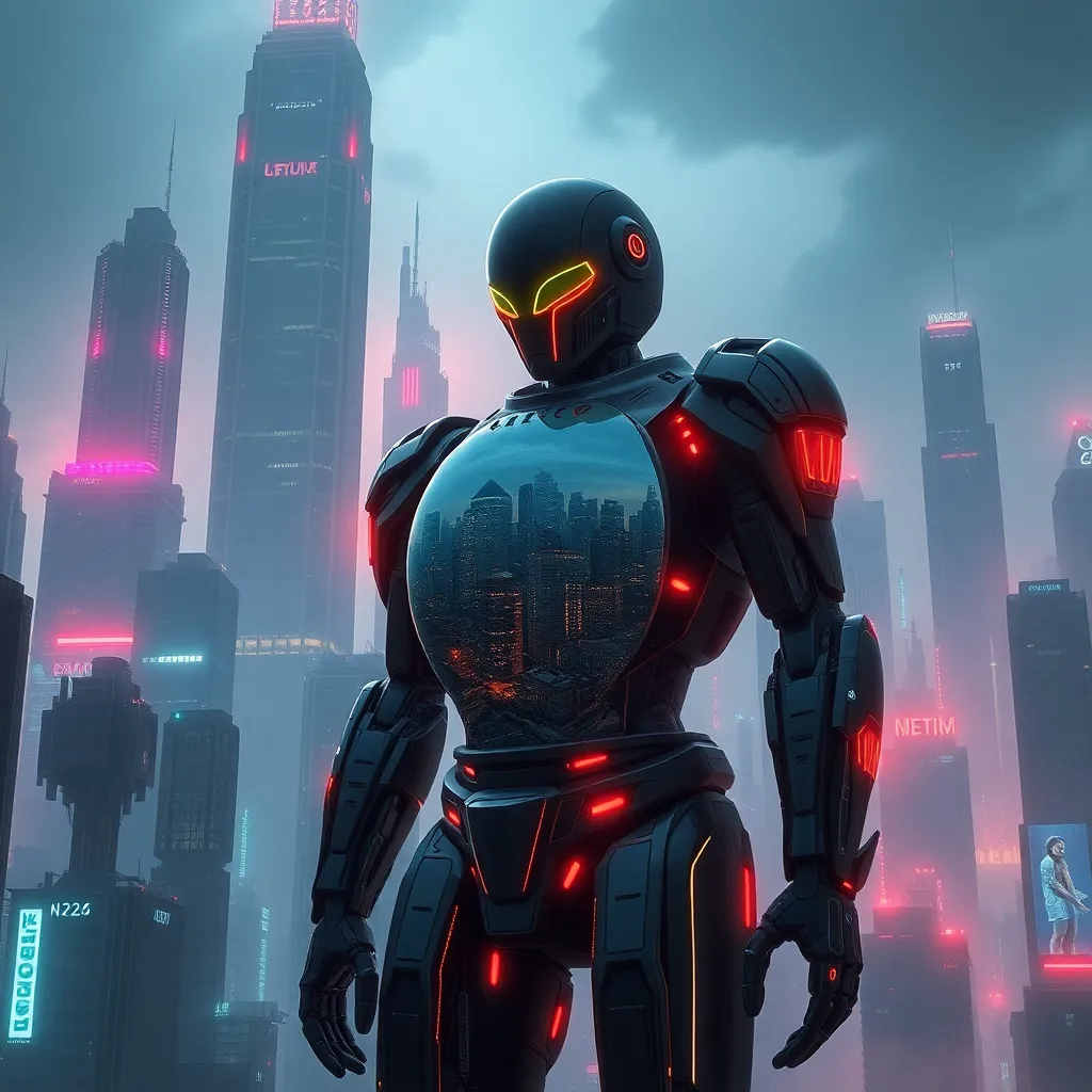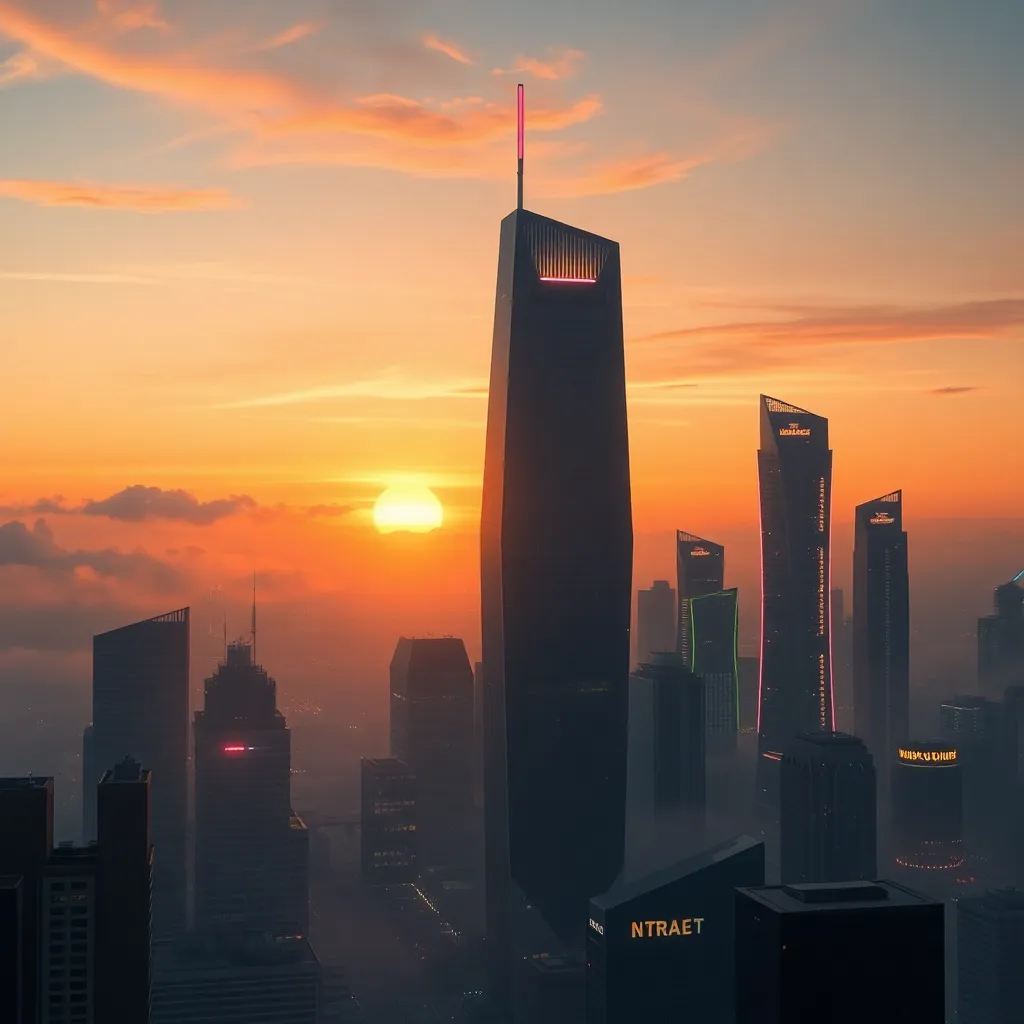 Create an AI-generated image of a serene, futuristic cityscape at sunset, with sleek skyscrapers, neon lights, and a misty atmosphere. Incorporate subtle, swirling clouds and a hint of iridescent colors. The image should evoke a sense of hope and optimism, with a focus on the fusion of technology and nature.
