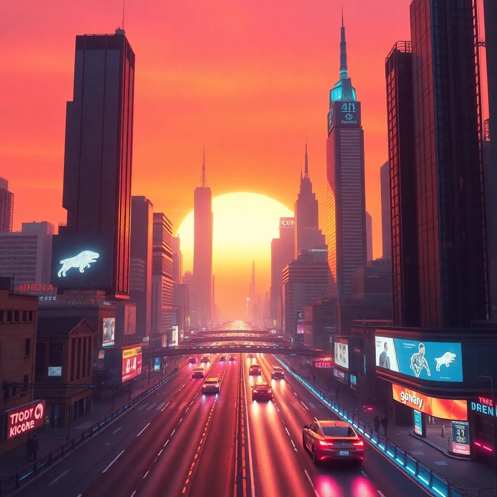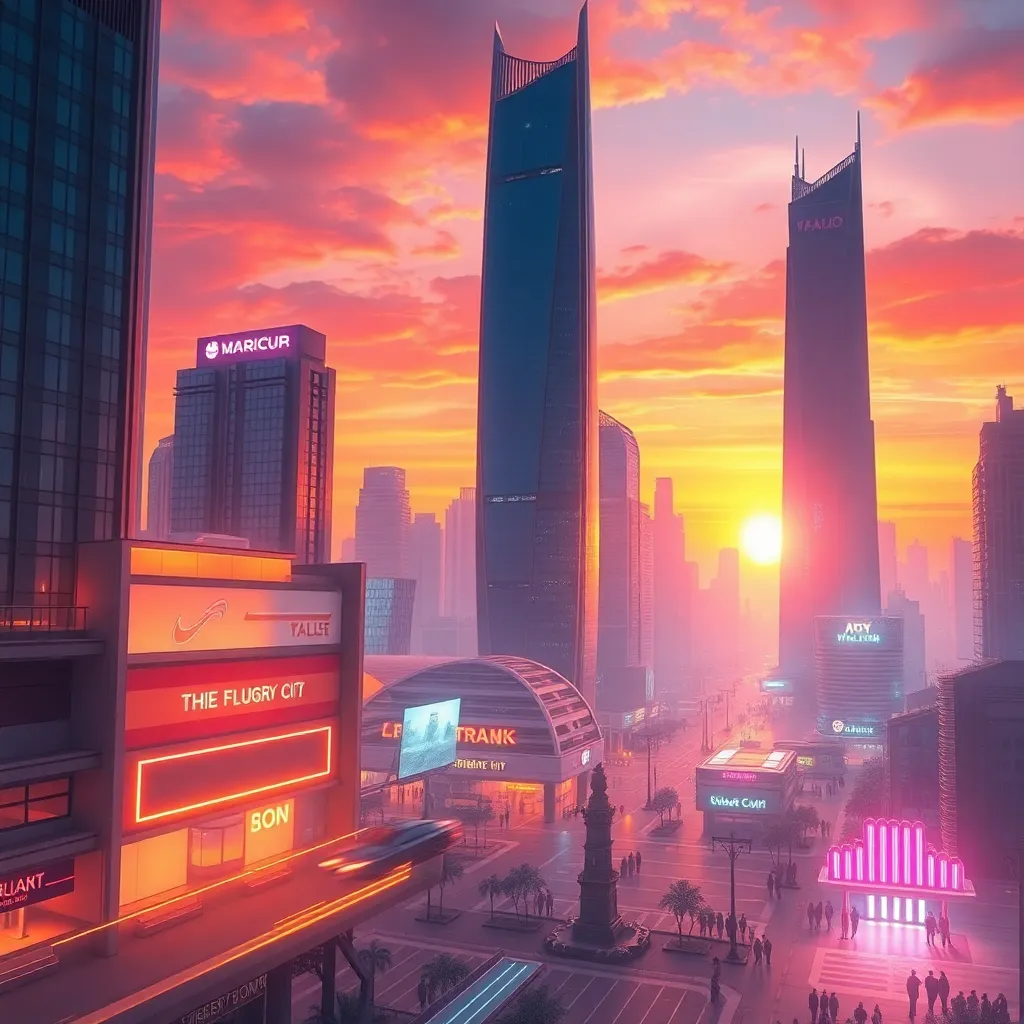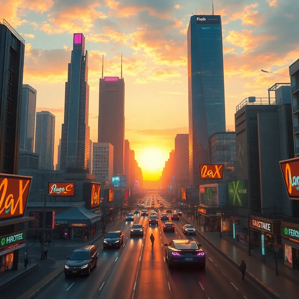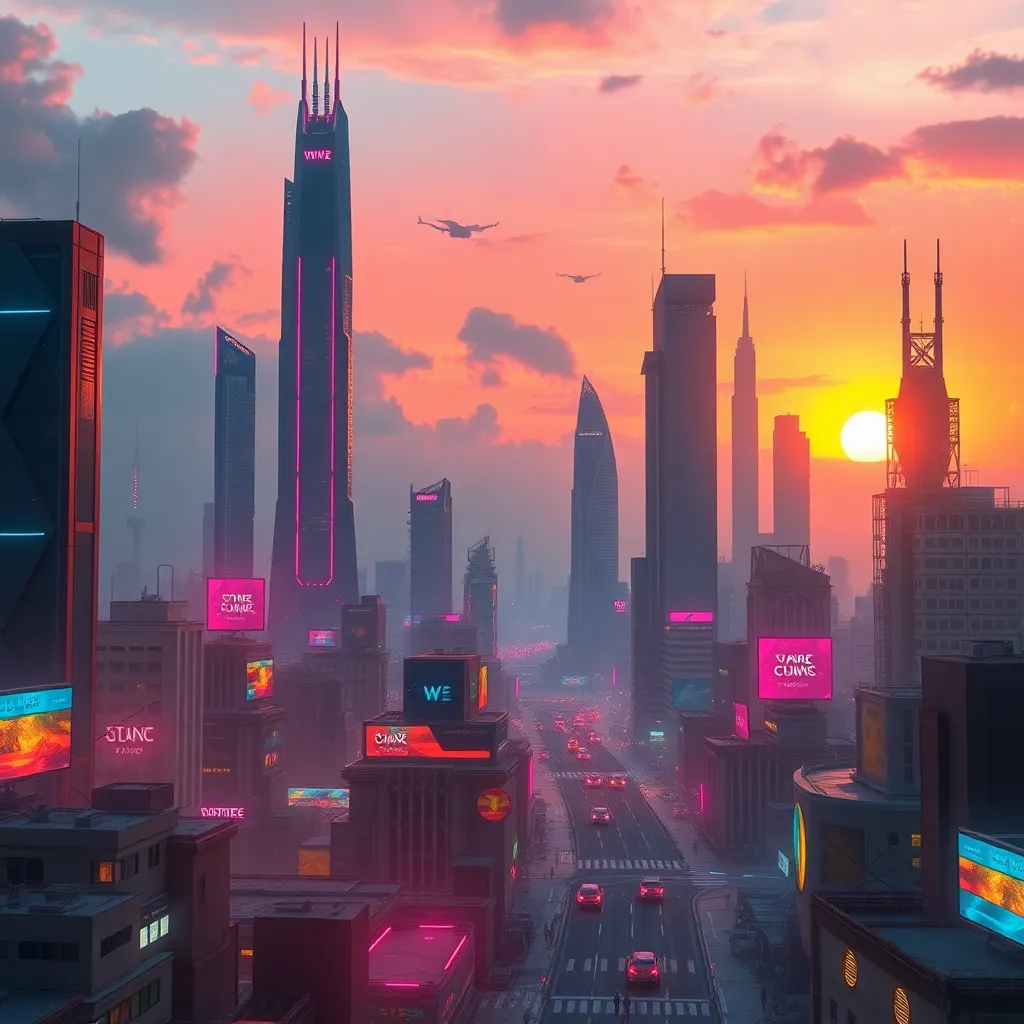 Create an AI-generated image of a futuristic cityscape at sunset, with sleek skyscrapers, flying cars, and a vibrant atmosphere. Incorporate neon lights, holographic advertisements, and a stunning orange-pink sky. The image should evoke a sense of innovation, technology, and excitement, with a dash of nostalgia and wonder.