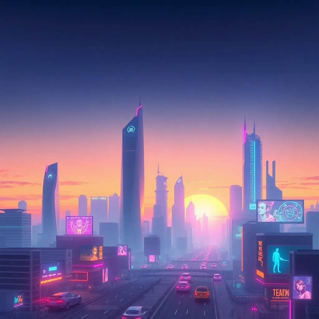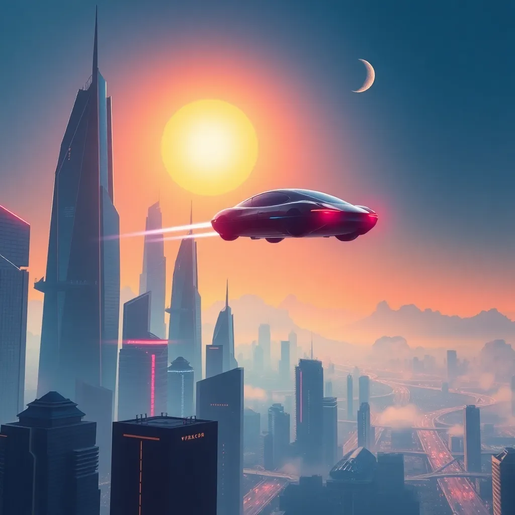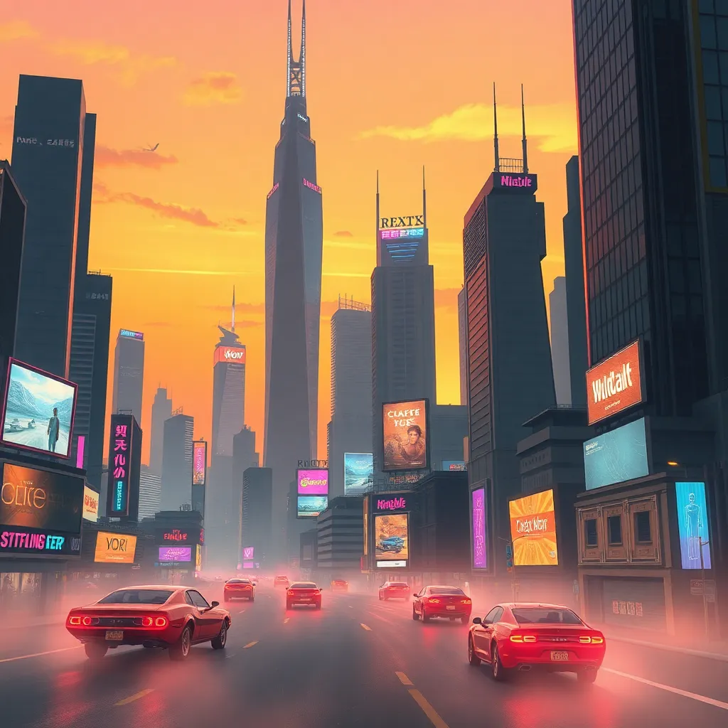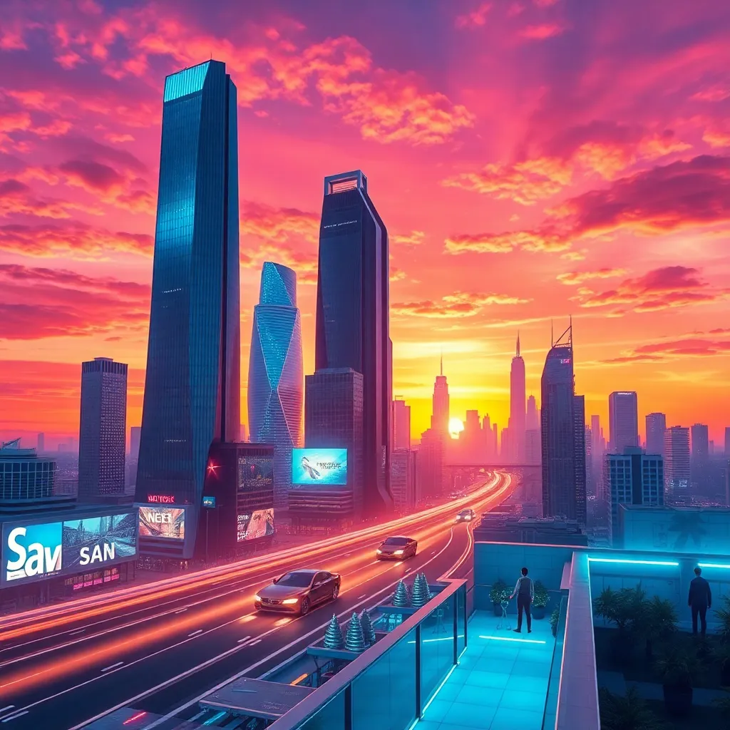 Create an AI-generated image of a futuristic cityscape at sunset, with sleek skyscrapers, flying cars, and a vibrant atmosphere. Incorporate neon lights, holographic advertisements, and a stunning orange-pink sky. The image should evoke a sense of innovation, technology, and excitement, with a dash of nostalgia and wonder.