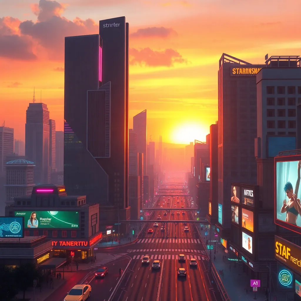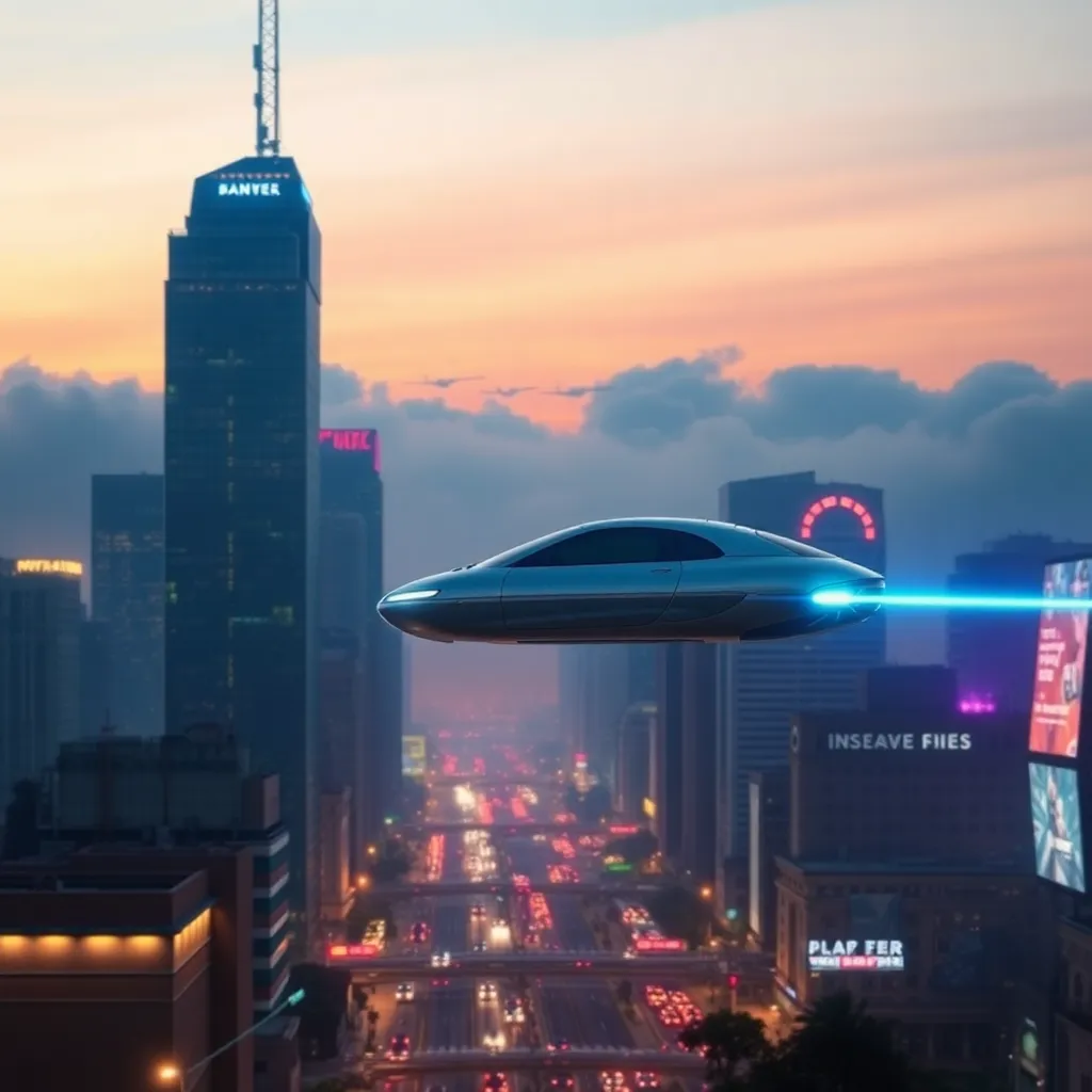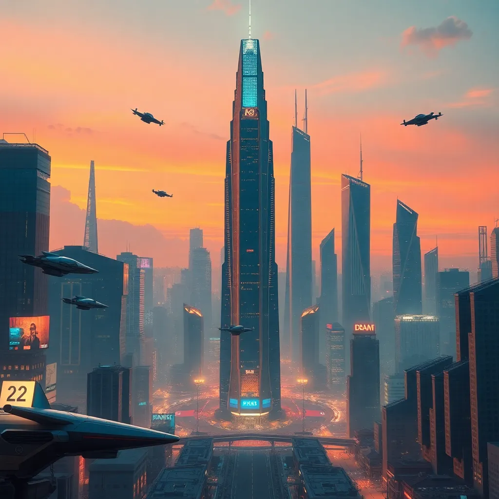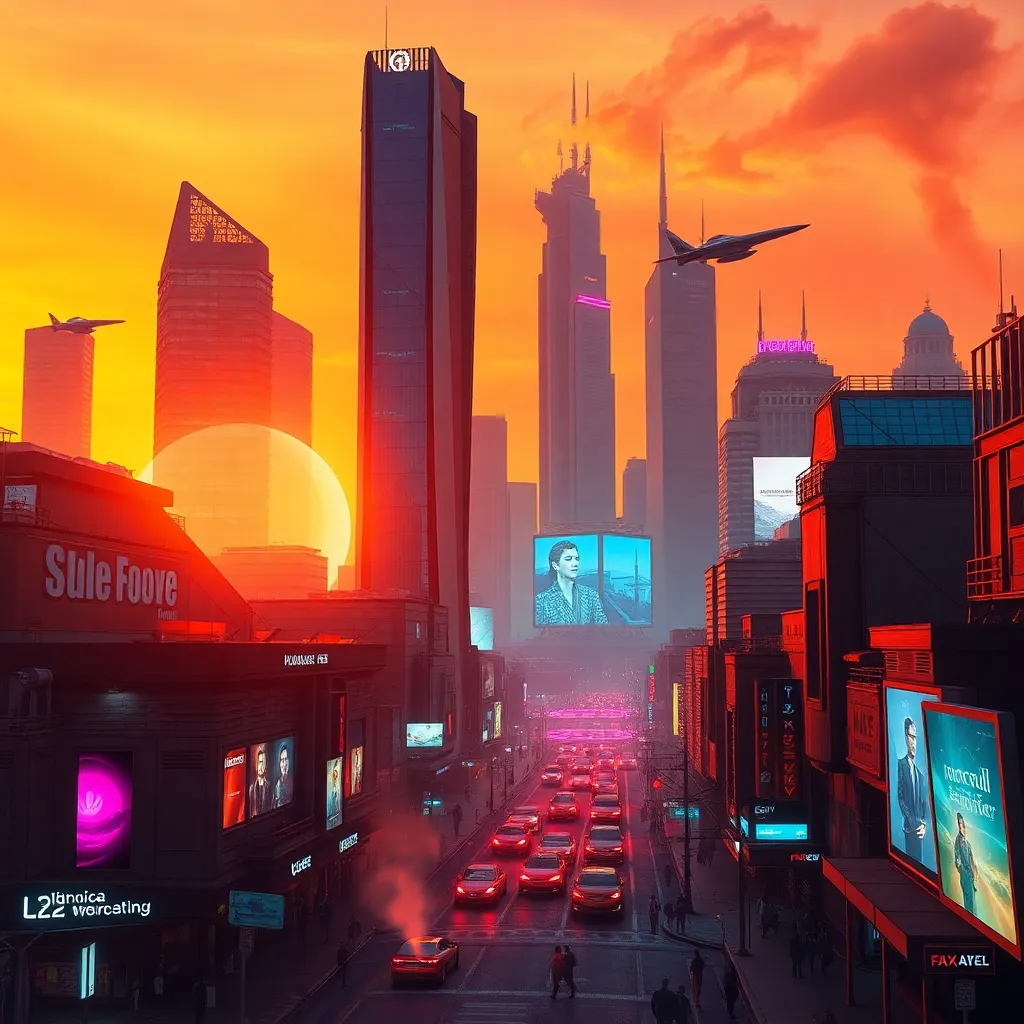 Create an AI-generated image of a futuristic cityscape at sunset, with sleek skyscrapers, flying cars, and a vibrant atmosphere. Incorporate neon lights, holographic advertisements, and a stunning orange-pink sky. The image should evoke a sense of innovation, technology, and excitement, with a dash of nostalgia and wonder.