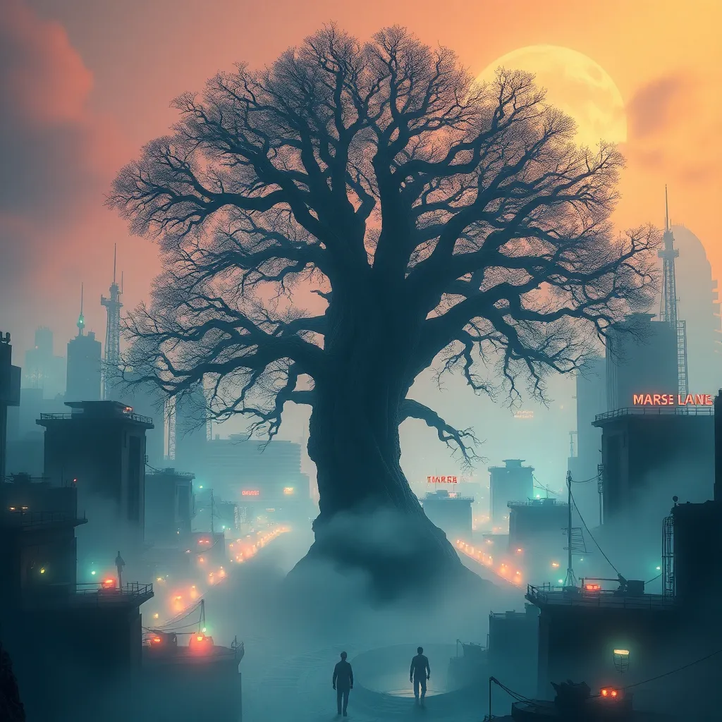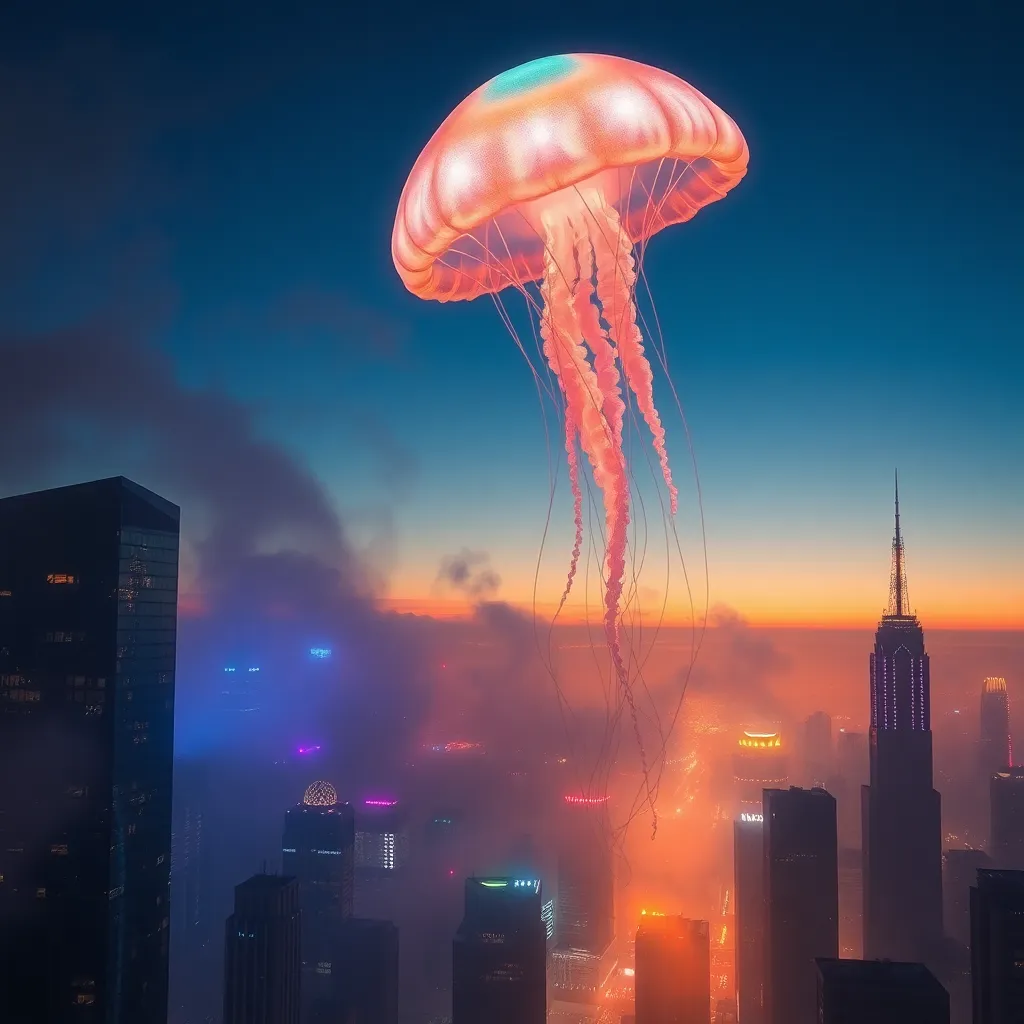 Create a surreal landscape featuring a giant, glowing jellyfish hovering above a cityscape at dusk. Incorporate vibrant, neon-lit skyscrapers and a misty atmosphere with hints of iridescent colors. The jellyfish should have an ethereal, dreamlike quality, as if it's a harbinger of an otherworldly presence.