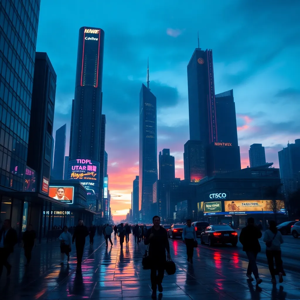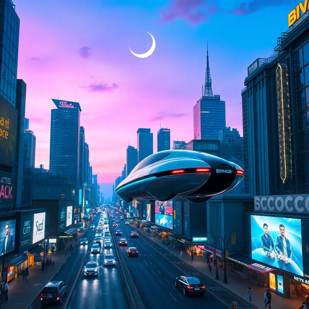 Create a futuristic cityscape at dusk with towering skyscrapers, neon lights, and a bustling street scene. Incorporate a sleek, silver hovercar hovering above the road, surrounded by holographic advertisements and a vibrant purple and blue sky with a crescent moon. Add a sense of movement and energy to the scene.