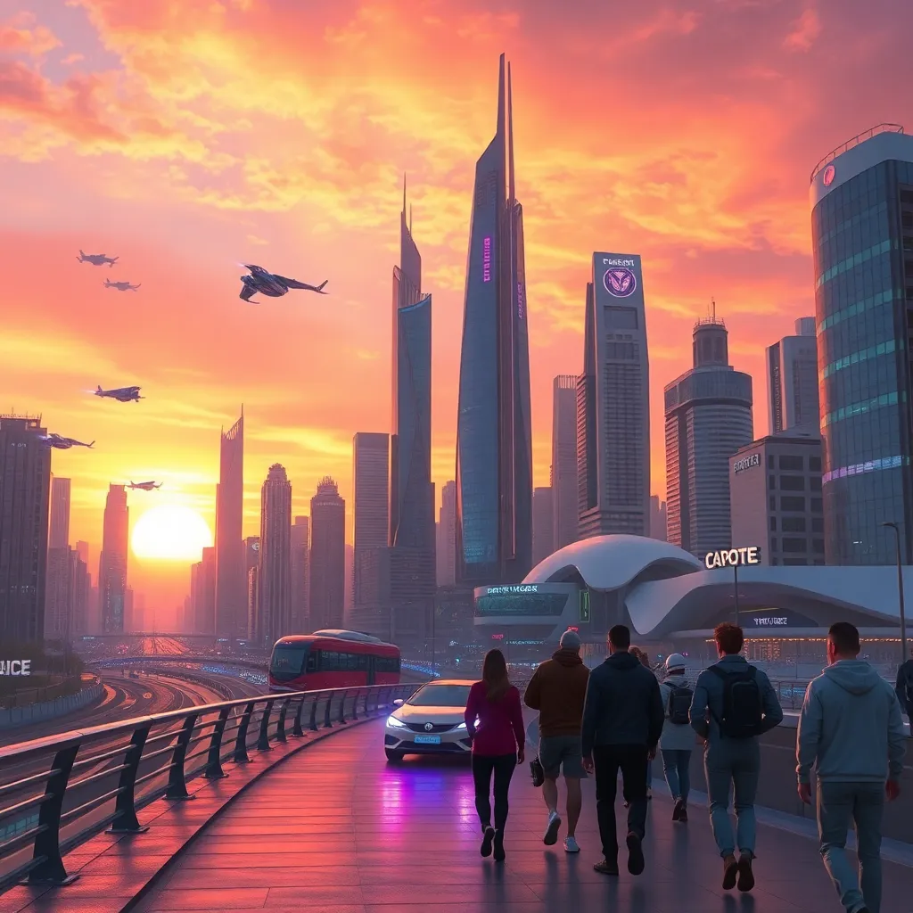 Imagine a futuristic cityscape at sunset, with sleek skyscrapers and flying cars zipping by. The sky is painted with vibrant hues of orange, pink, and purple. A group of people in futuristic attire walk along the sidewalk, enjoying the breathtaking view. Add a sense of nostalgia and wonder to the scene.