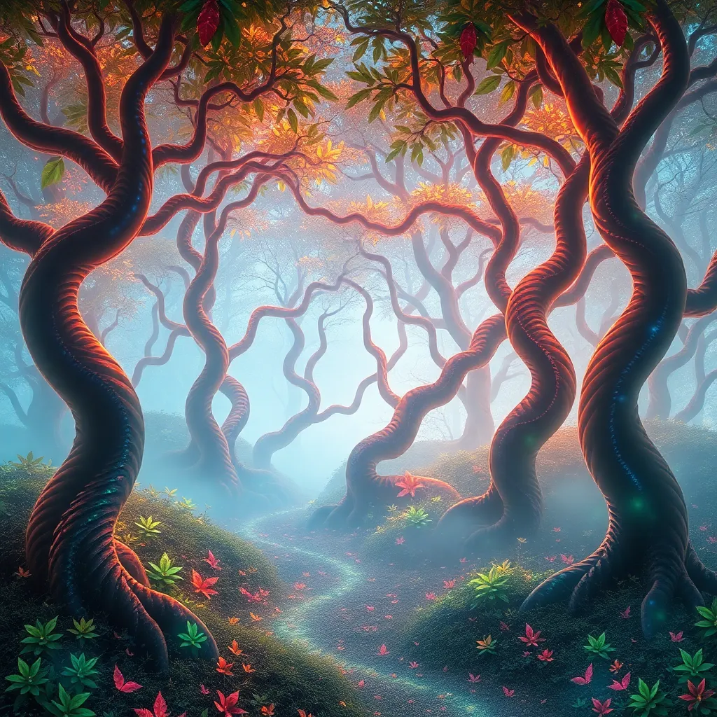 Create a surreal landscape featuring a glowing, iridescent forest with twisted tree trunks and leaves that shift between colors. Incorporate a subtle, pulsing mist that reacts to the viewer's movement, as if the forest is alive. Use vibrant, dreamlike colors and a sense of depth to immerse the viewer.