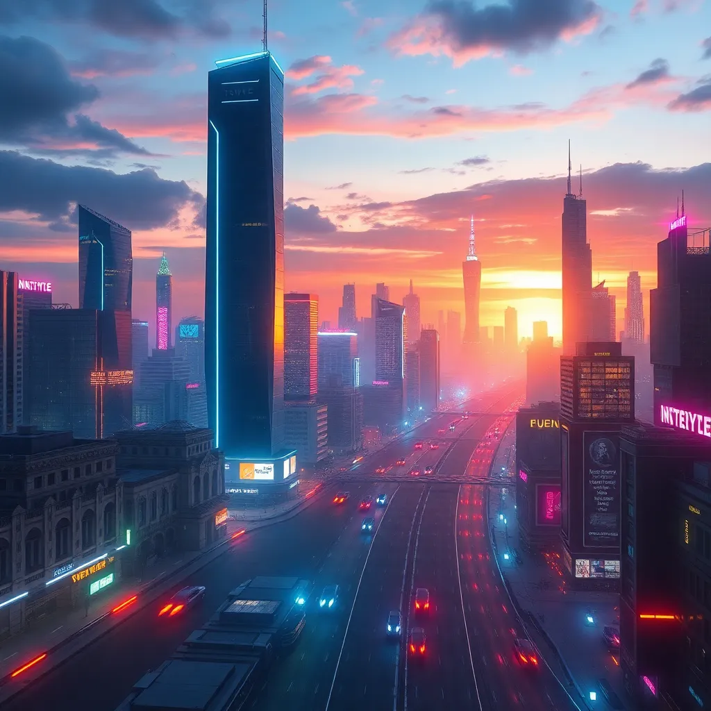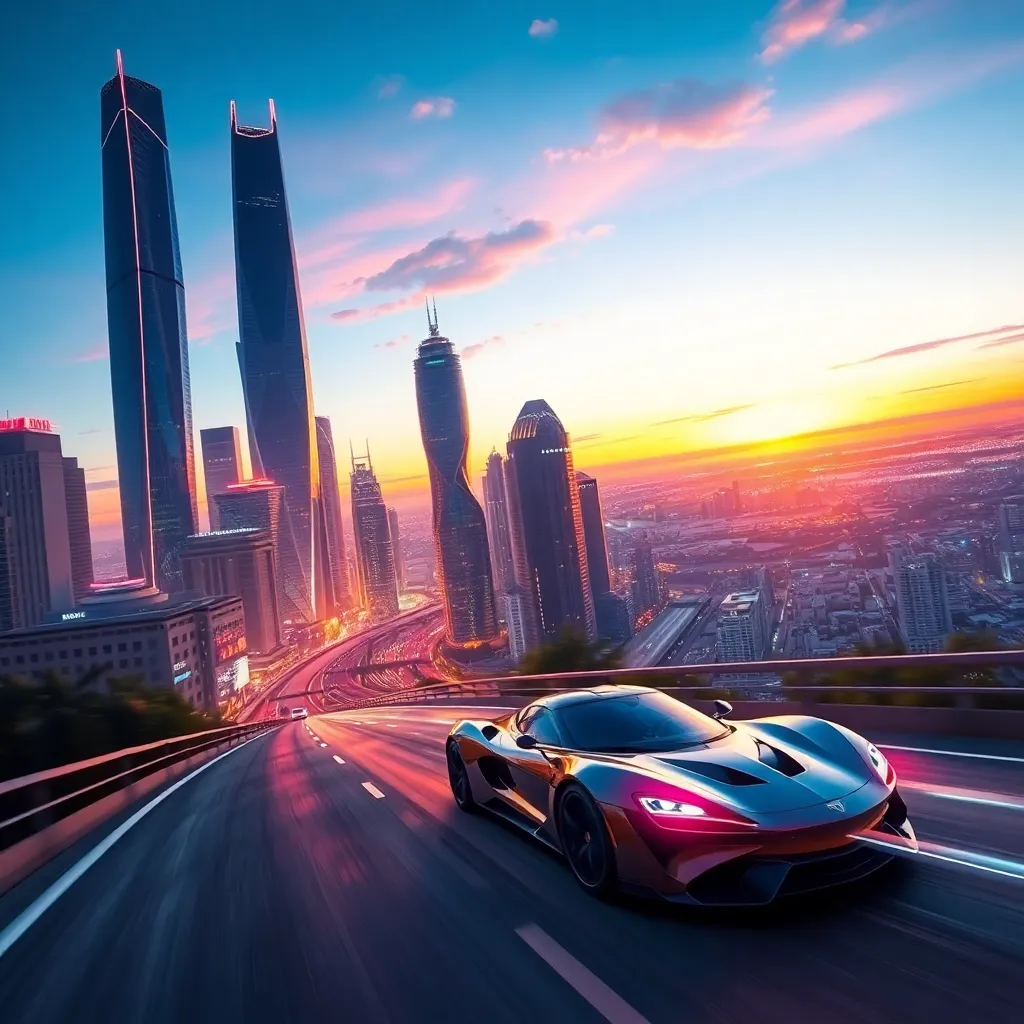 Create a futuristic cityscape at sunset, with towering skyscrapers, neon lights, and a sprawling metropolis in the distance. Incorporate a sleek, high-tech sports car speeding down the highway, leaving a trail of light behind it. The atmosphere should be vibrant and energetic, with a hint of mystery.