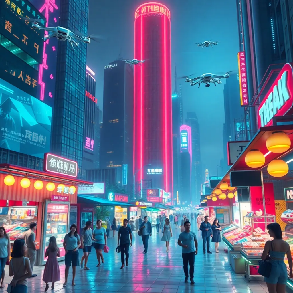 Create an AI-generated image of a futuristic cityscape with a vibrant neon-lit night market, featuring towering skyscrapers, flying drones, and humans of diverse backgrounds shopping and socializing amidst a kaleidoscope of colors and lights, with a subtle hint of artificial intelligence and technology integrated into the urban landscape.