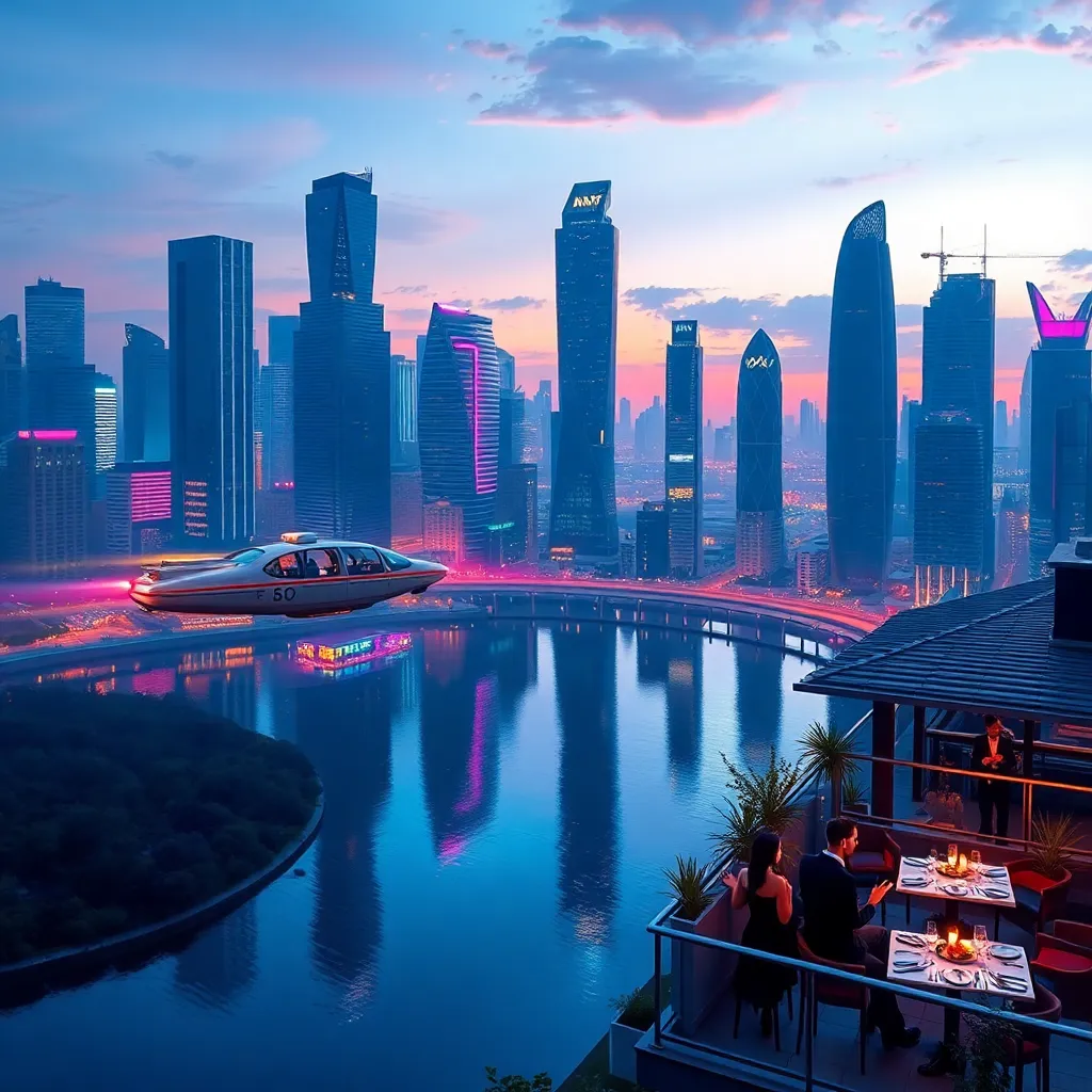 Create a futuristic cityscape at sunset, with towering skyscrapers and neon lights reflecting off a serene lake. Incorporate a flying taxi hovering above the water, and a group of people enjoying a romantic dinner on a rooftop patio. The atmosphere should be vibrant and inviting, with a touch of magic.