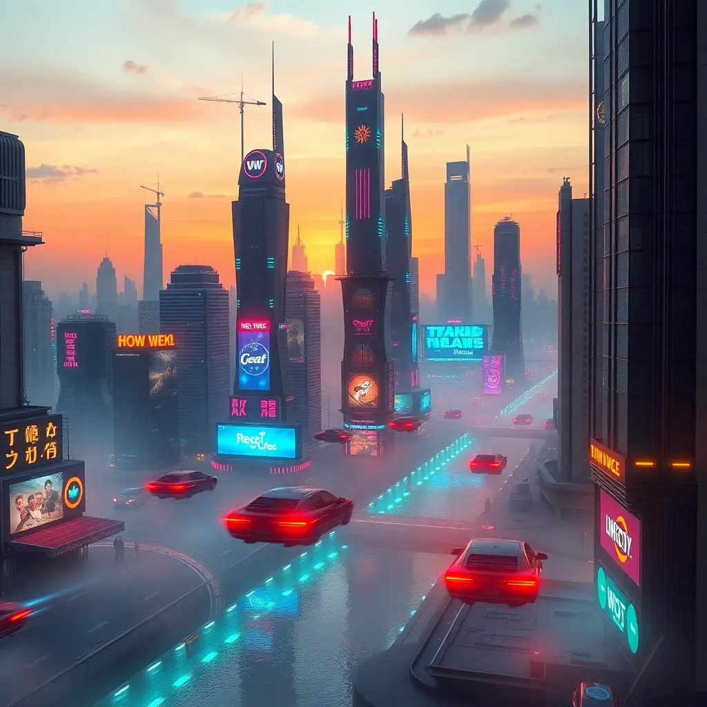 Generate an image of a futuristic cityscape at sunset, with towering skyscrapers, flying cars, and a vibrant atmosphere. Incorporate neon lights, holographic advertisements, and a sense of dynamic energy. The city should be surrounded by a misty atmosphere, with a hint of a futuristic lake or canal in the distance.