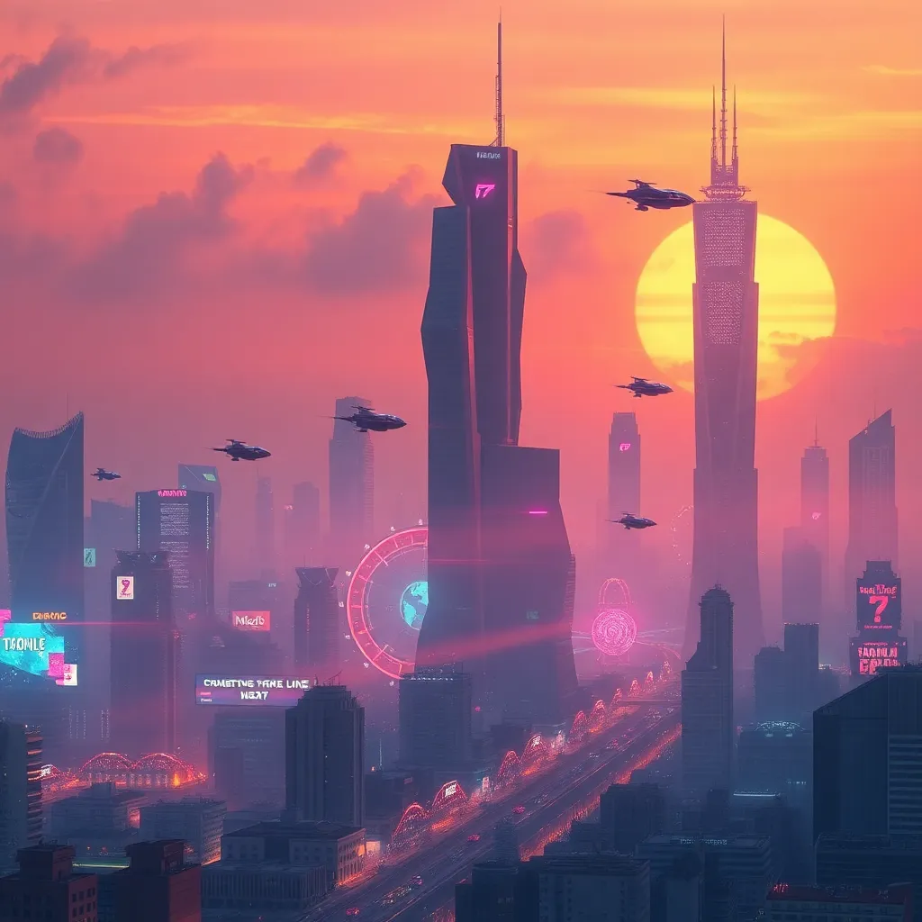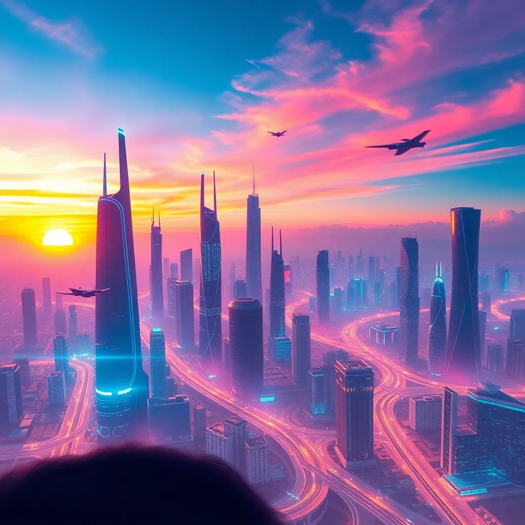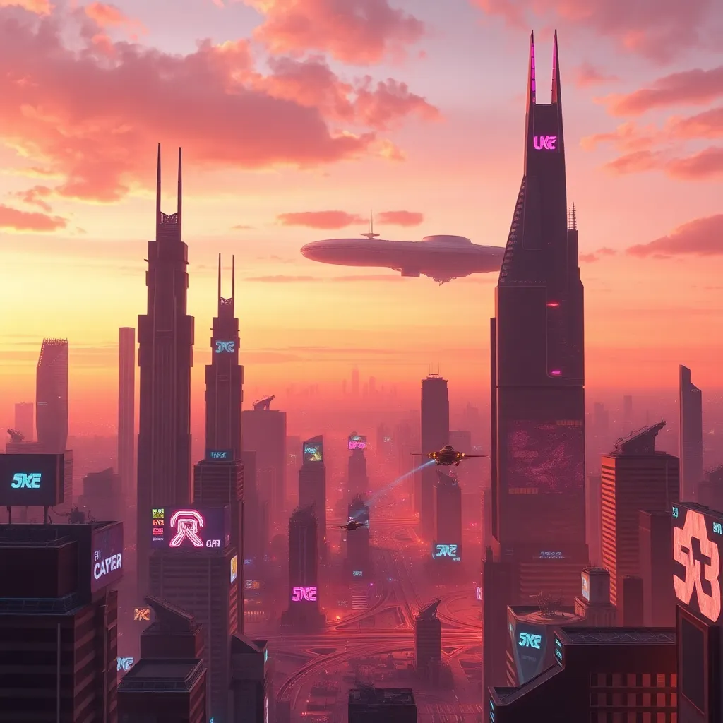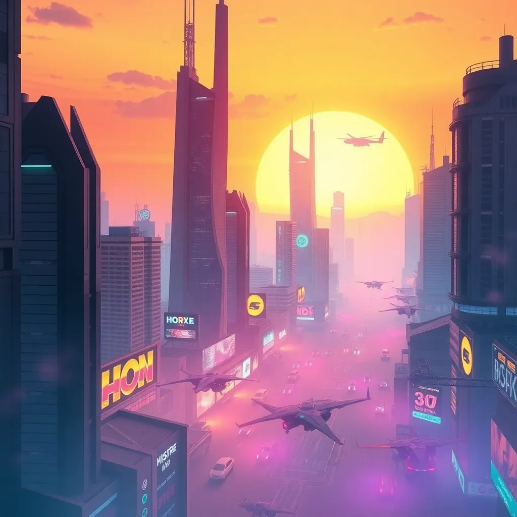 Create a futuristic cityscape at sunset with towering skyscrapers, flying cars, and a vibrant atmosphere. Incorporate neon lights, holographic advertisements, and a distant view of a massive space station. Use a warm color palette with shades of orange, pink, and purple to capture the dynamic energy of the scene.