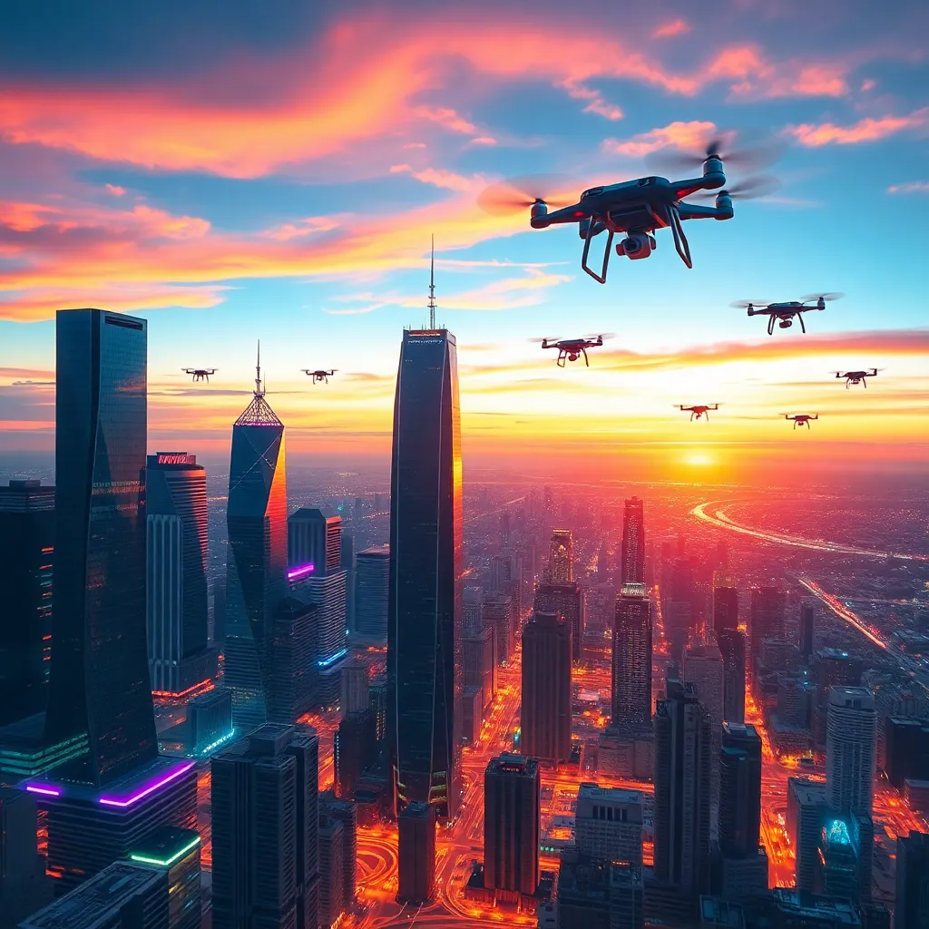 Generate a futuristic cityscape at sunset, with sleek skyscrapers, hovering drones, and a cityscape that blends seamlessly into the horizon. Incorporate vibrant colors, neon lights, and a sense of depth and dimensionality. The image should evoke a sense of innovation, progress, and limitless possibility.
