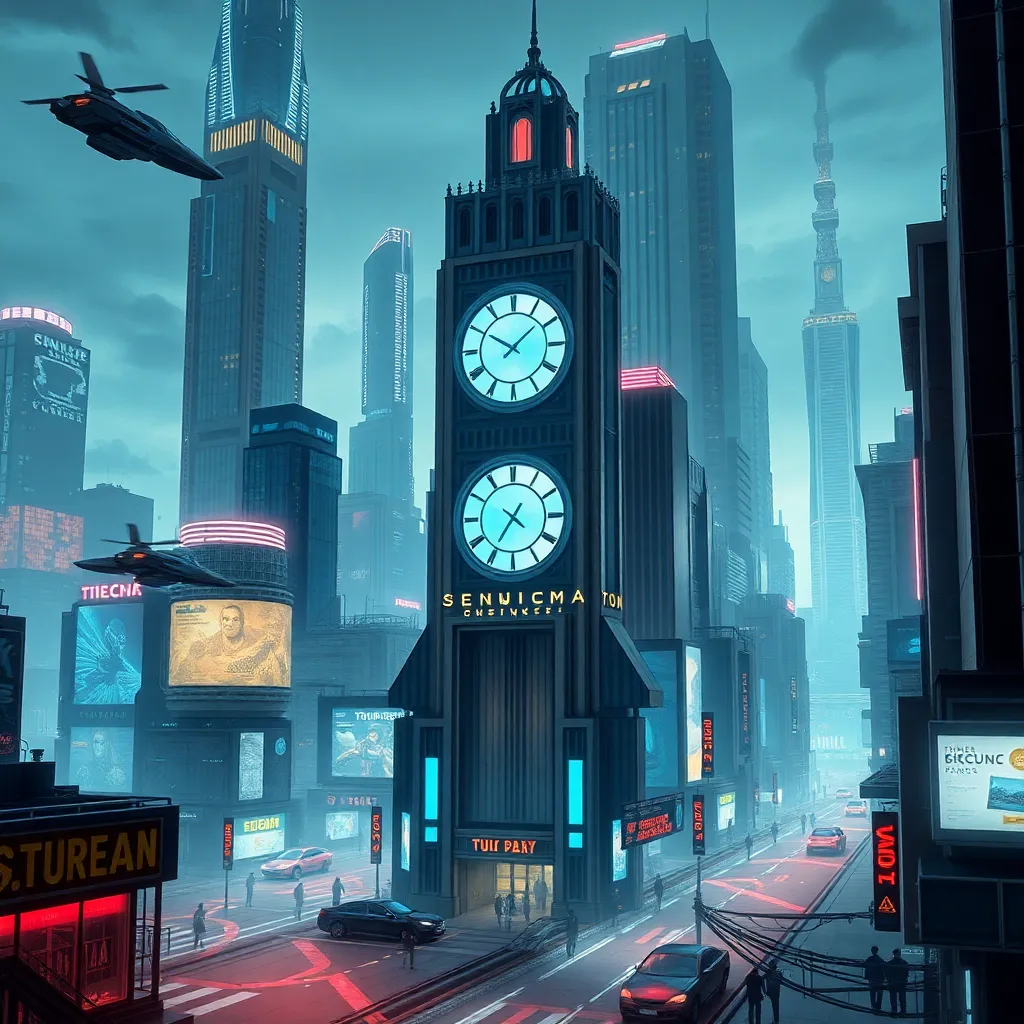 Create a futuristic cityscape wallpaper with towering skyscrapers, flying cars, and neon lights. Incorporate a prominent clock tower with a glowing blue face, surrounded by a bustling metropolis with holographic advertisements and humans going about their daily lives. Add a sense of depth and dimensionality to the scene.