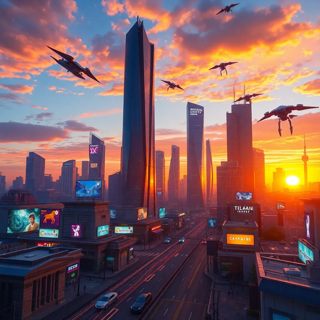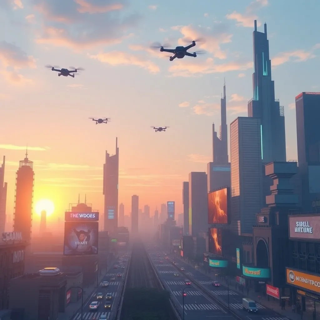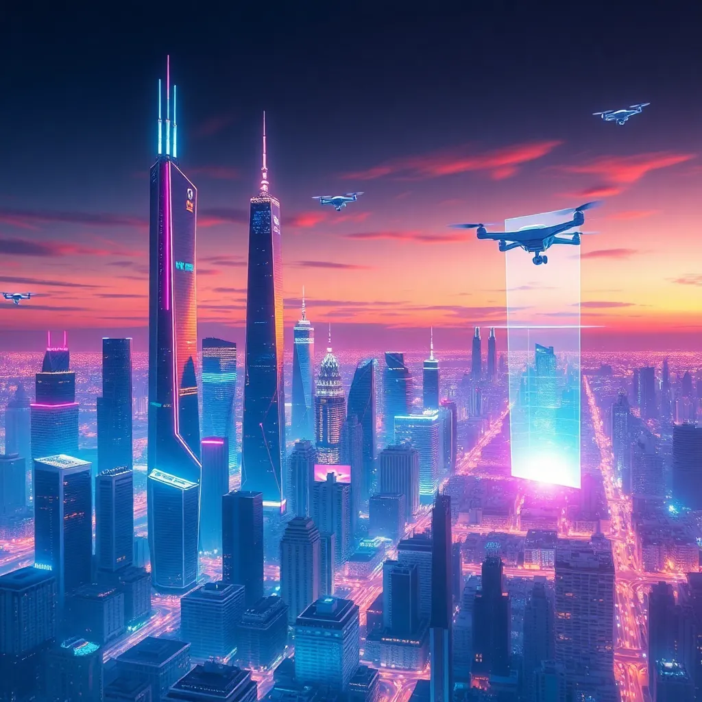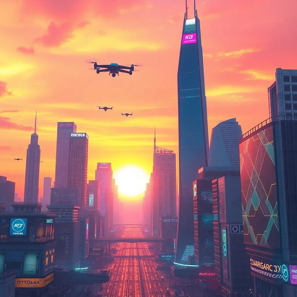Generate a futuristic cityscape at sunset, featuring towering skyscrapers, holographic advertisements, and a sprawling metropolis with a hint of neon lights and sleek architecture. Incorporate AI-generated elements, such as floating drones and augmented reality projections, to create a vibrant and immersive visual experience.