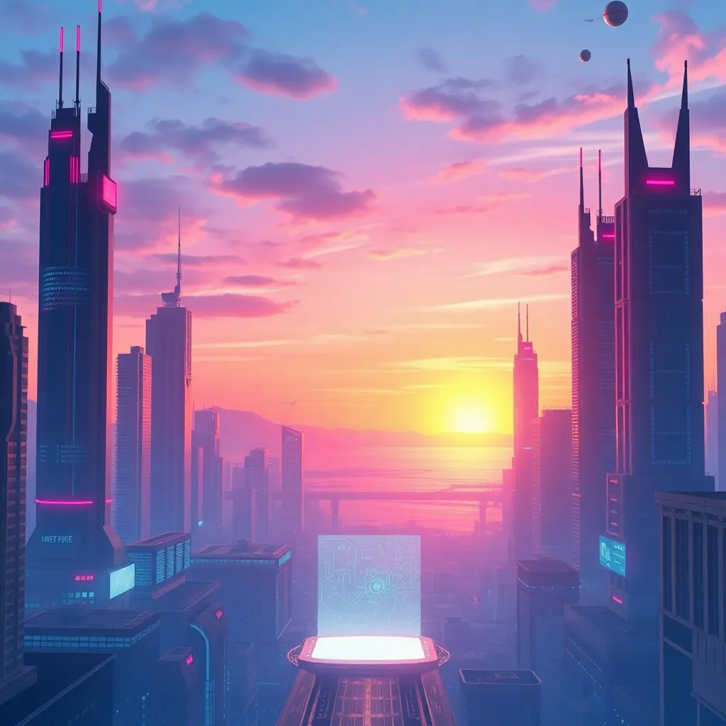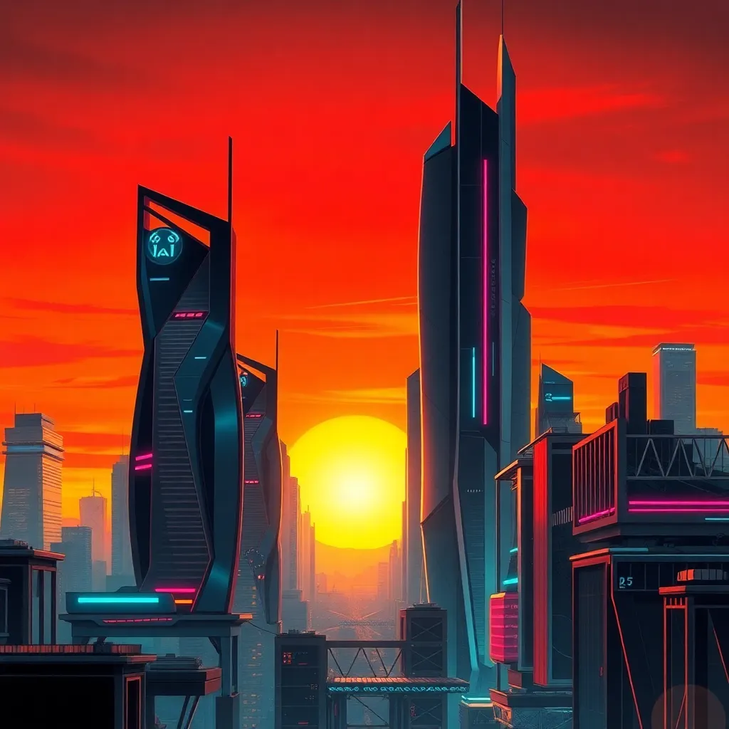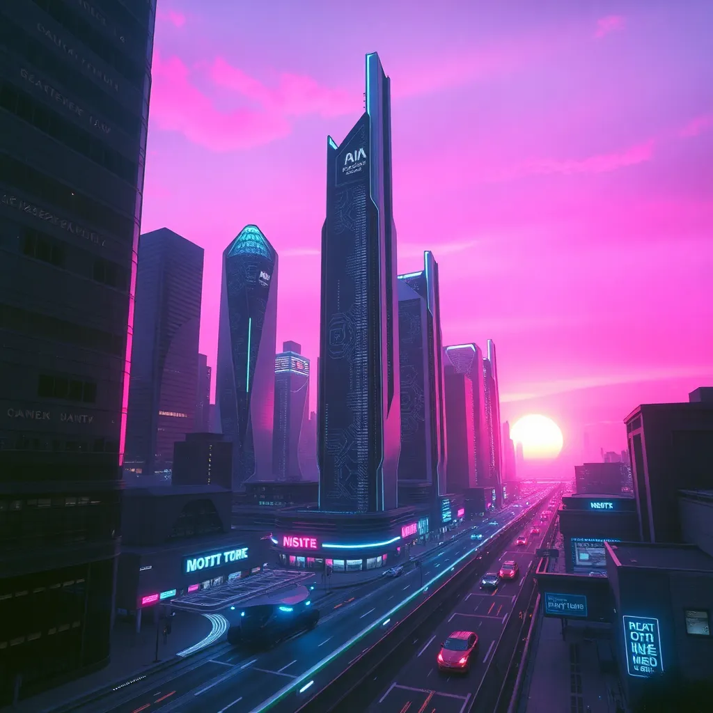 Generate a futuristic cityscape at sunset, with sleek skyscrapers, neon lights, and a hint of artificial intelligence integration. Incorporate subtle AI-inspired elements, such as circuit boards or robot silhouettes, to create a unique and captivating visual representation of the intersection of technology and urban life.