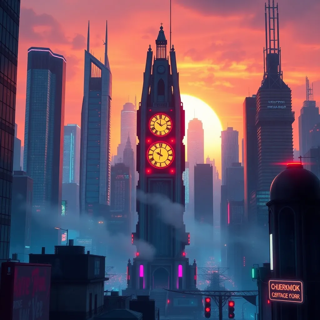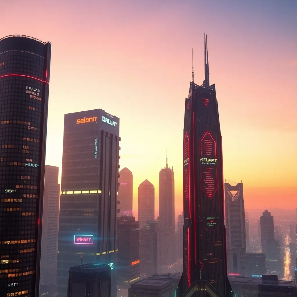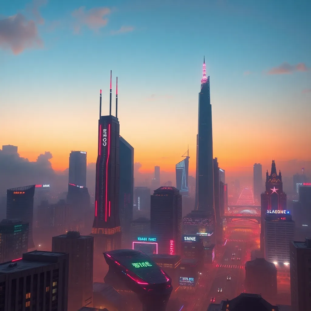 Generate a futuristic cityscape at sunset, with sleek skyscrapers, neon lights, and a hint of artificial intelligence integration. Incorporate subtle AI-inspired elements, such as circuit boards or robot silhouettes, to create a unique and captivating visual representation of the intersection of technology and urban life.