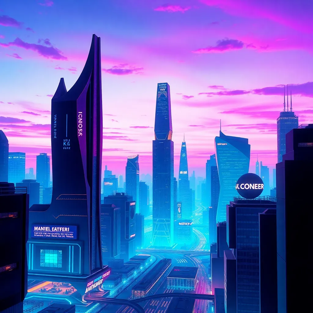 Create a futuristic cityscape at sunset, with sleek skyscrapers, hovering drones, and a vibrant purple sky. Incorporate neon lights, holographic advertisements, and a sense of bustling activity. The image should be high-contrast, with bold colors and a dynamic composition that evokes a sense of innovation and progress.