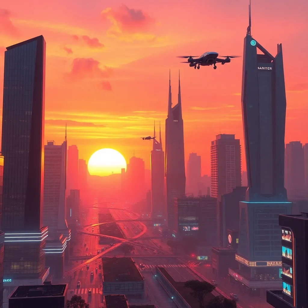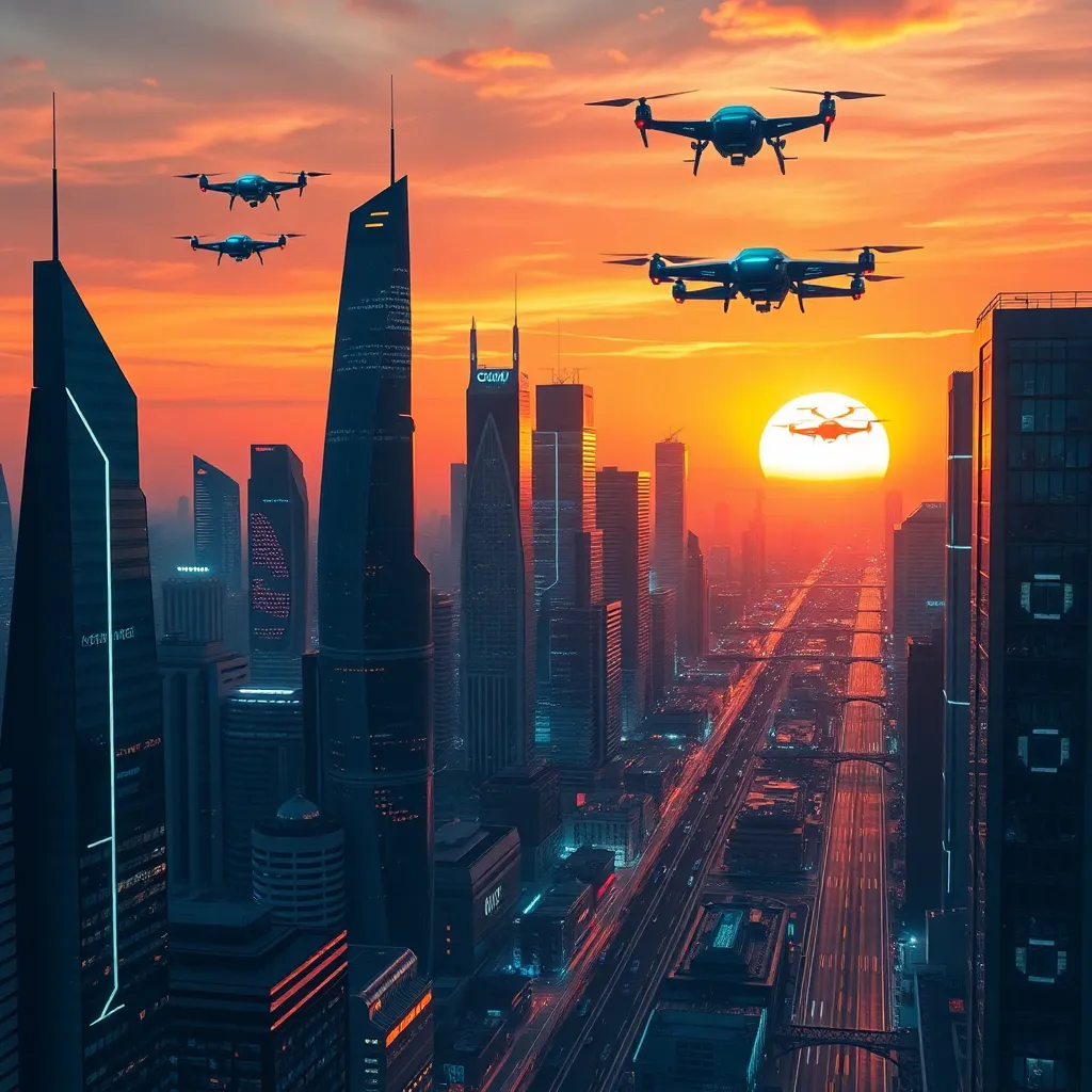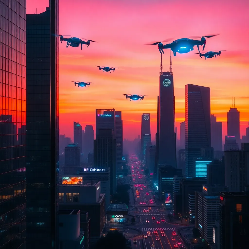 Create a futuristic cityscape at sunset, with sleek skyscrapers, neon-lit streets, and a vibrant orange-pink sky. Incorporate AI-generated robots and drones flying overhead, with a subtle glow emanating from their bodies. The city should have a sense of technology and innovation, with a hint of mystery and wonder.