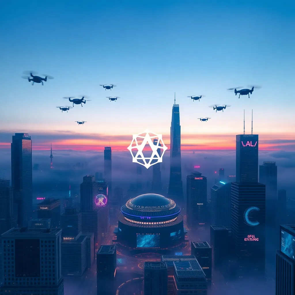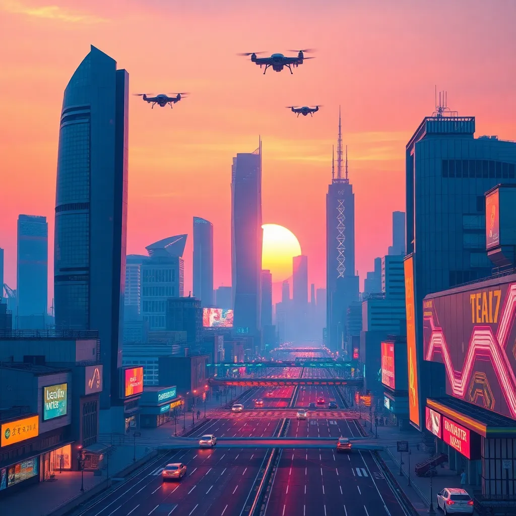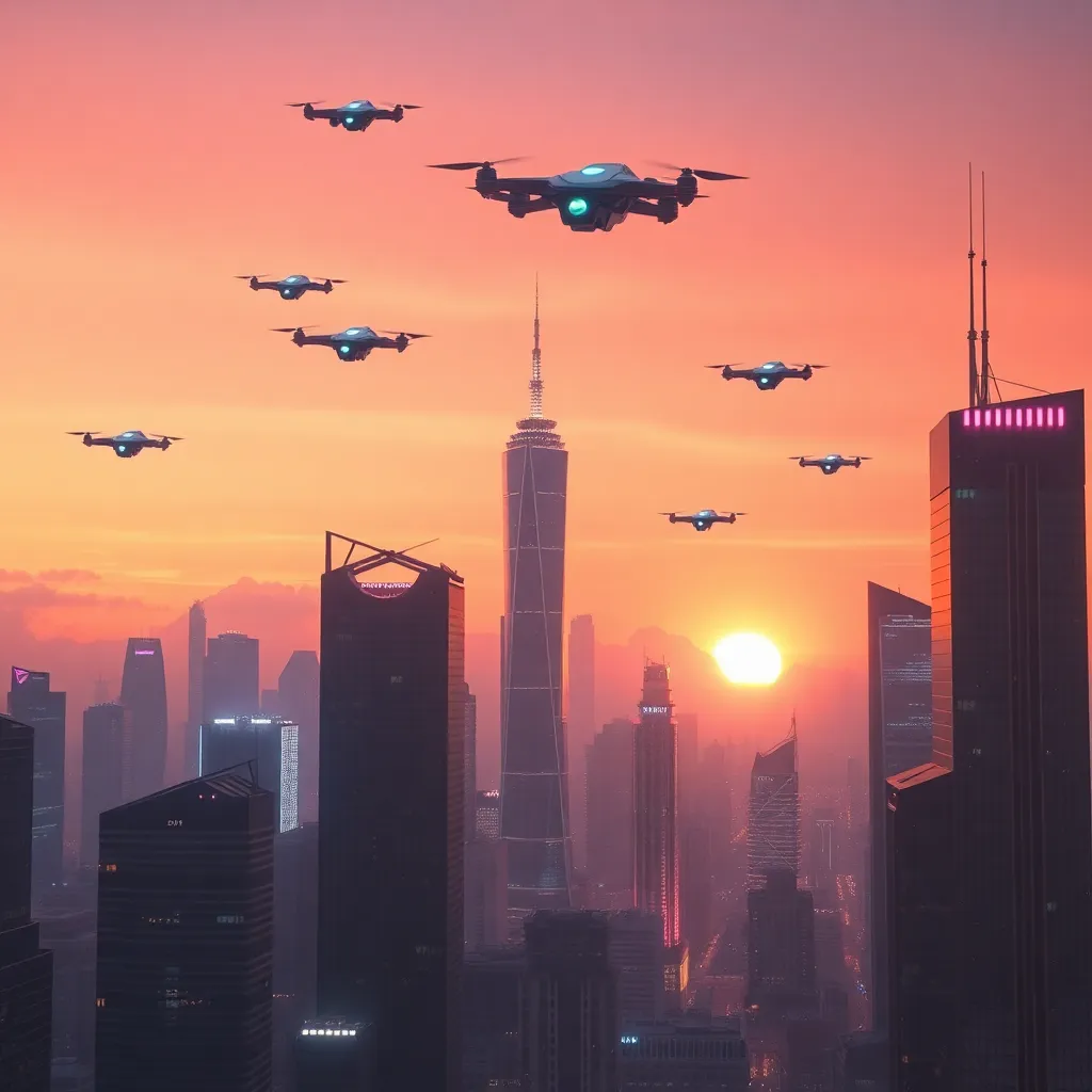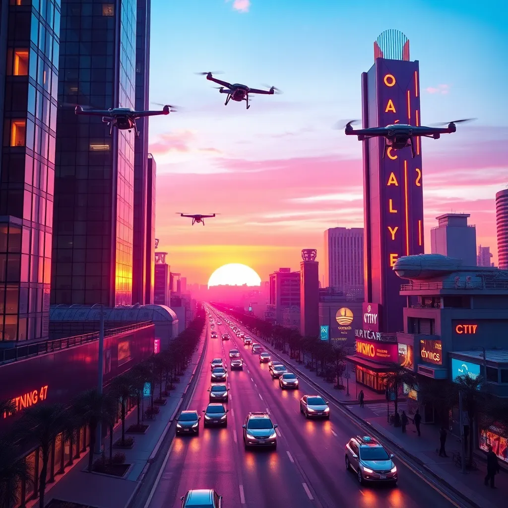 Create a futuristic cityscape at sunset, with sleek skyscrapers, neon-lit streets, and a vibrant orange-pink sky. Incorporate AI-generated robots and drones flying overhead, with a subtle glow emanating from their bodies. The city should have a sense of technology and innovation, with a hint of mystery and wonder.
