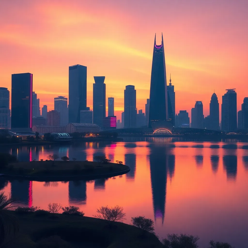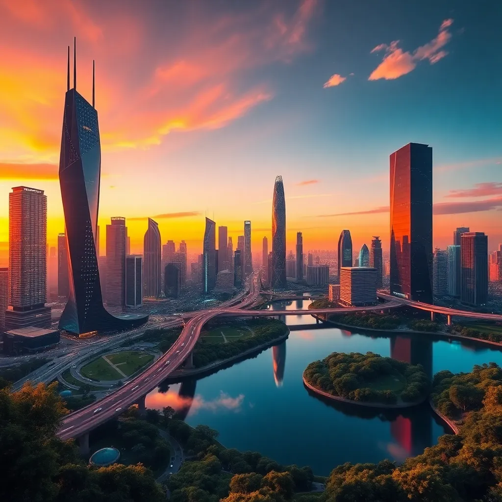 Create a futuristic cityscape at sunset with sleek skyscrapers, neon lights, and a vibrant orange hue. Incorporate subtle AI-generated patterns and textures on the buildings and roads. Blend the city with a serene lake in the foreground, surrounded by lush greenery and a few wispy clouds. Make it visually striking!