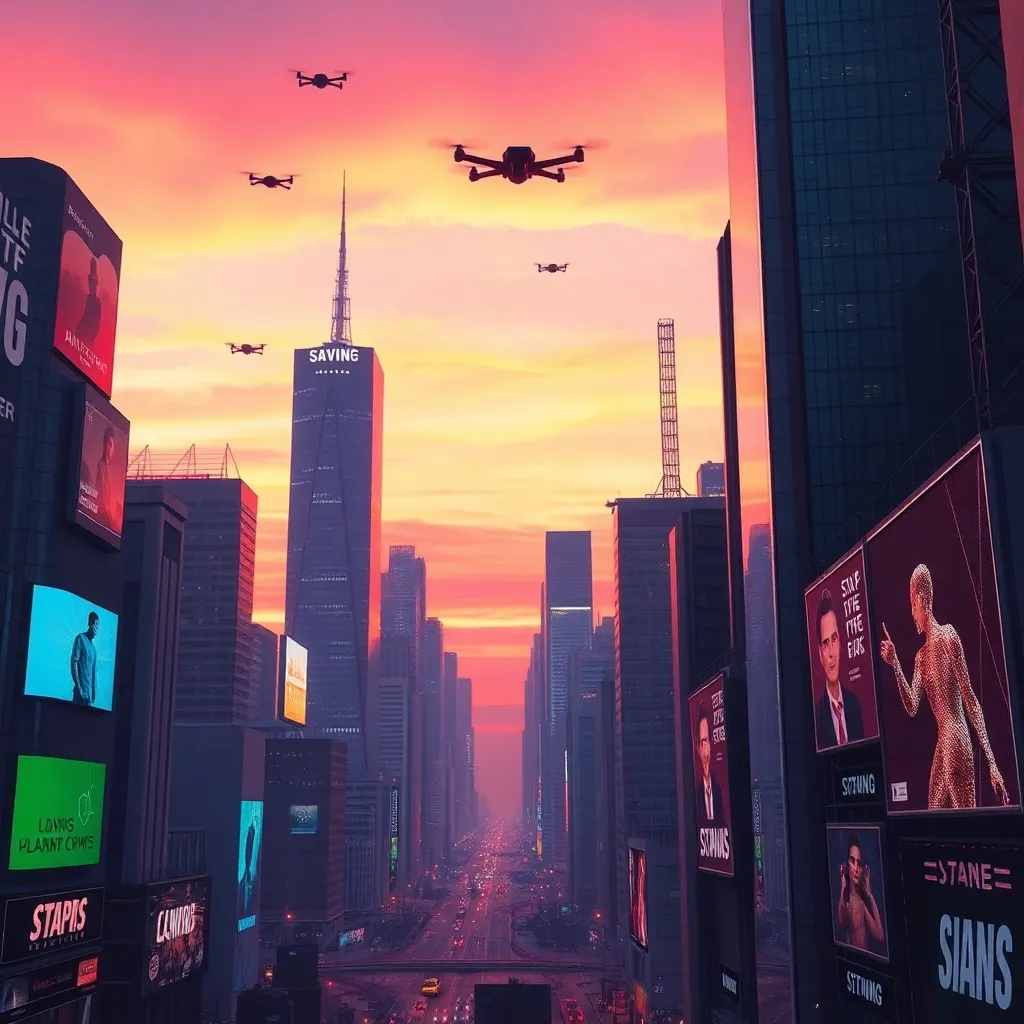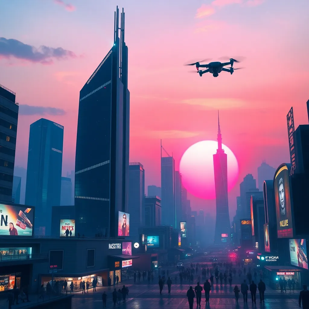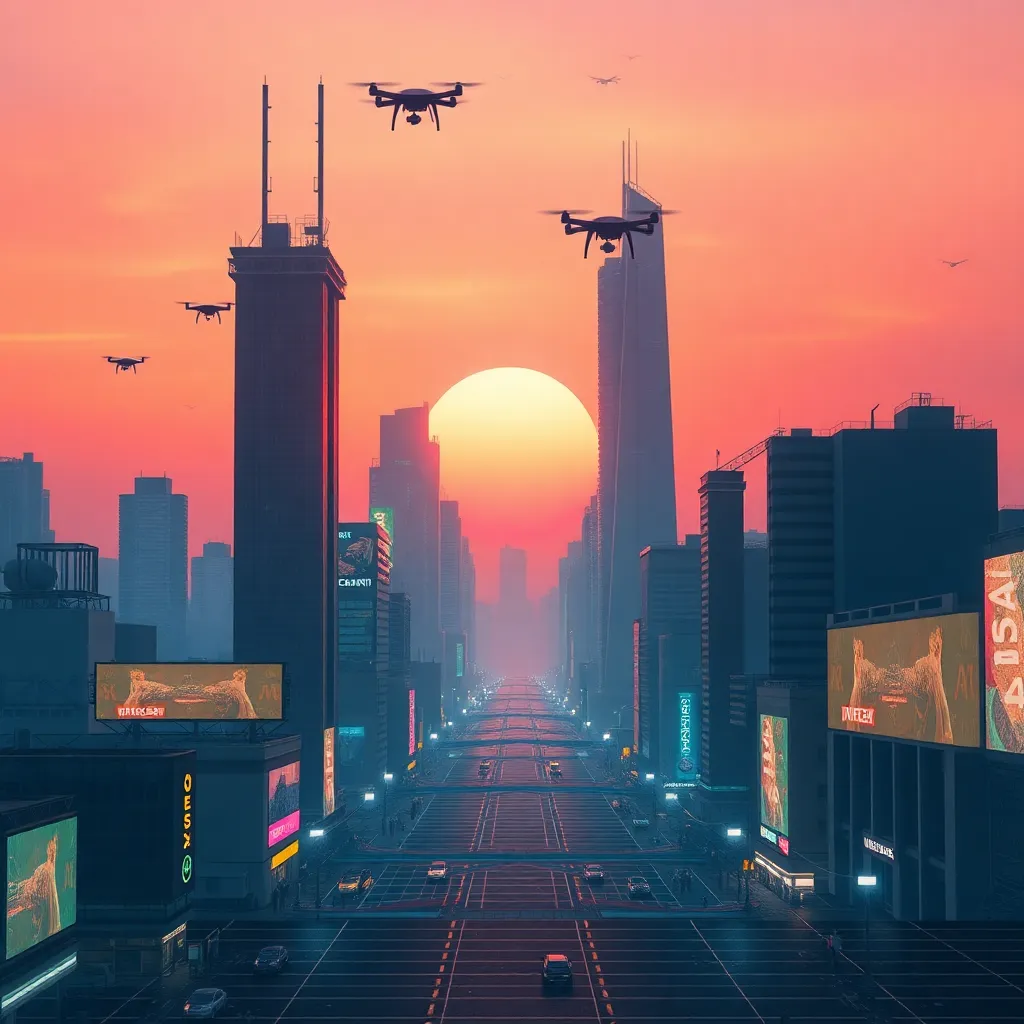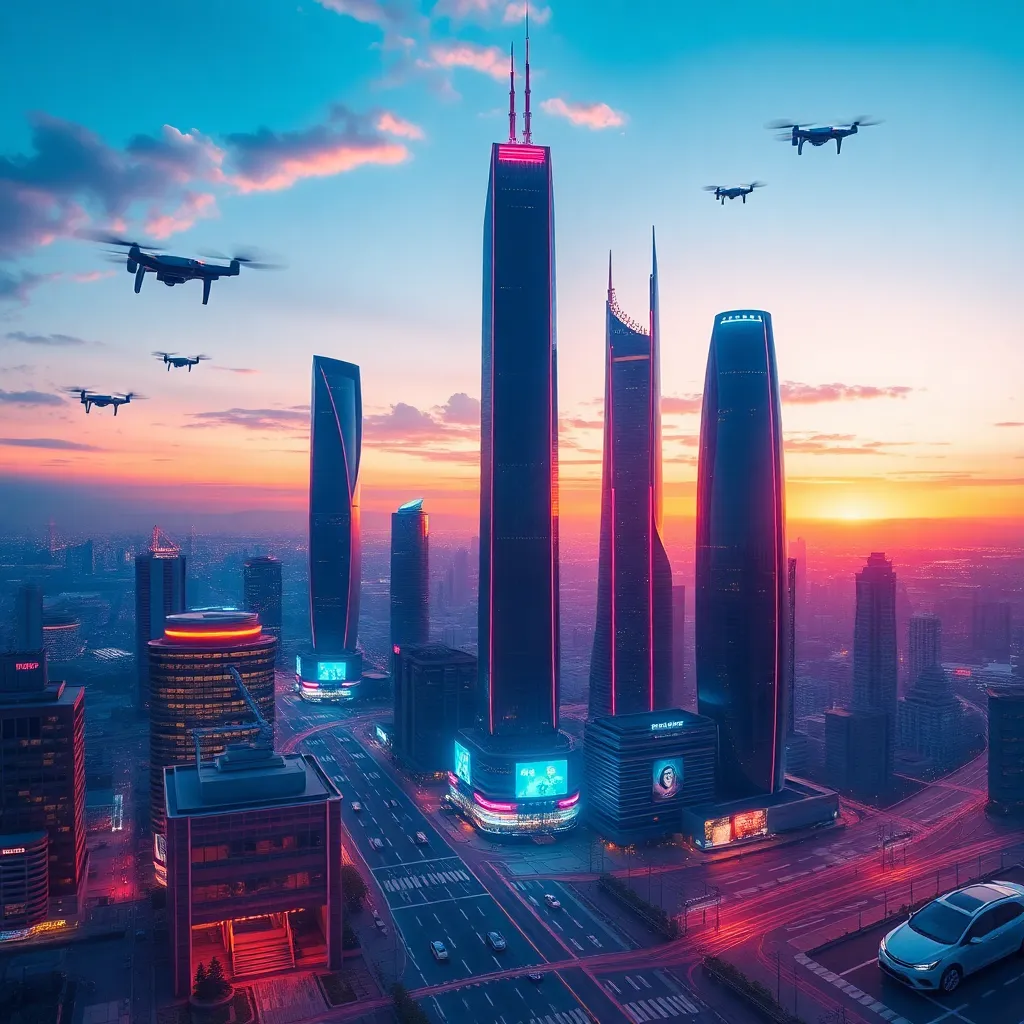 Create a futuristic cityscape at sunset, with towering skyscrapers, neon-lit billboards, and a vibrant orange-pink sky. Incorporate AI-generated details such as flying drones, holographic advertisements, and a subtle grid of LED lights outlining the buildings. The image should exude a sense of modernity and innovation.
