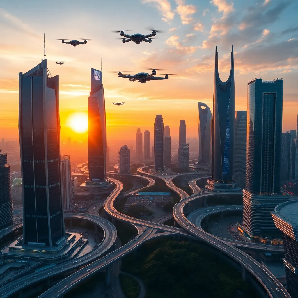 Create a futuristic cityscape at sunrise, with sleek skyscrapers, winding roads, and a vibrant atmosphere. Incorporate AI-generated elements such as hovering drones, neon lights, and a subtle aura of technology. The dominant colors should be shades of blue, orange, and silver. Make it visually striking and futuristic.