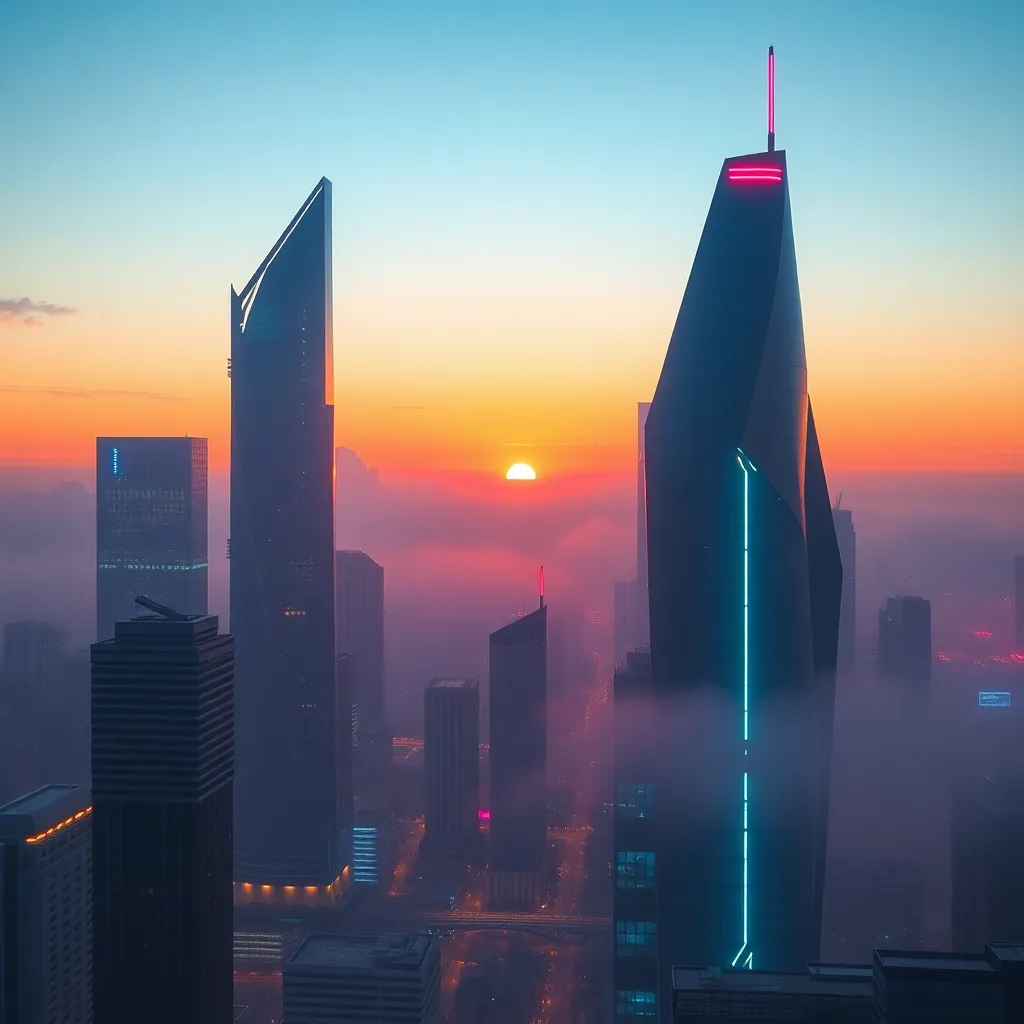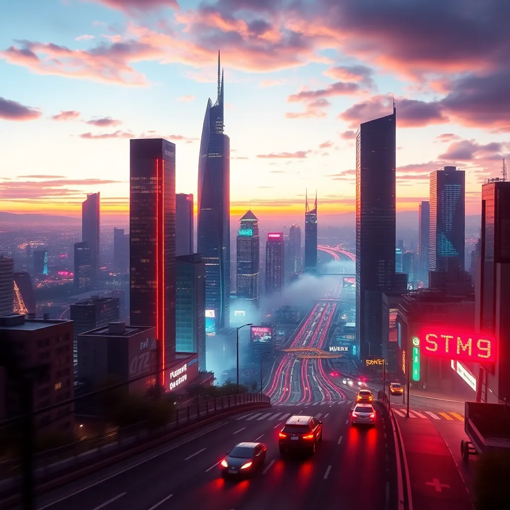 Create a futuristic cityscape at dusk, with sleek skyscrapers, neon lights, and a sprawling metropolis. Incorporate a sense of movement with blurred cars and a hint of fog. The dominant color palette should be a warm blend of oranges, purples, and blues. Add a touch of mystery with a subtle, glowing aura.