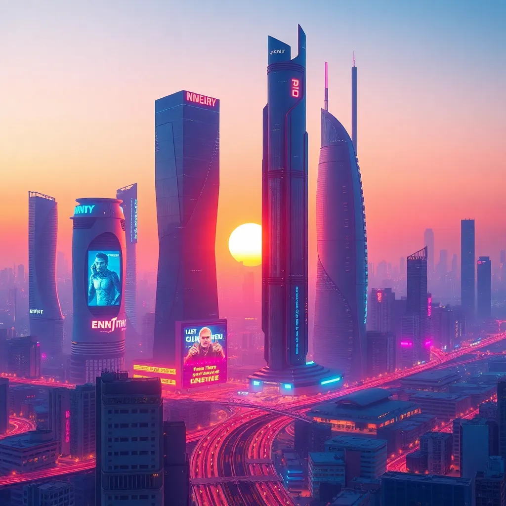 Generate a futuristic cityscape at sunset, with sleek skyscrapers, neon-lit streets, and a vibrant atmosphere. Incorporate AI-generated elements, such as holographic advertisements, flying cars, and towering robots, to create a visually stunning and immersive scene that showcases the intersection of technology and urban life.
