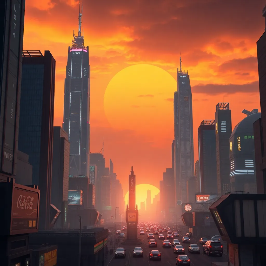 Create a futuristic cityscape at sunset, with towering skyscrapers, neon lights, and a vast, orange-hued sky. Incorporate subtle AI-generated patterns and textures to give the image a sense of depth and realism. The city should be bustling with life, with flying cars and robots moving through the streets.