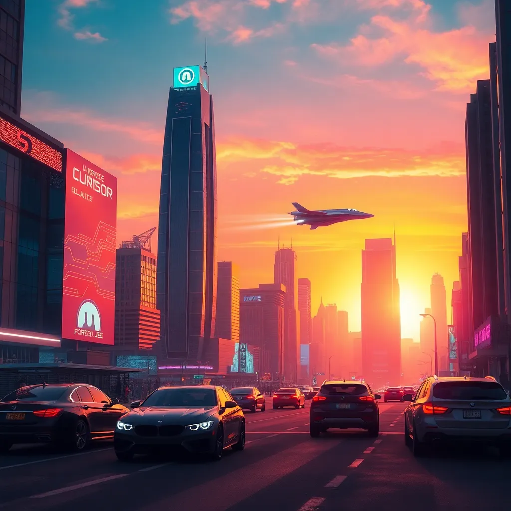 Create a futuristic cityscape at sunset, with sleek skyscrapers, neon-lit streets, and a glowing orange sky. Incorporate AI-generated elements such as hovering drones, flying cars, and holographic advertisements. Use a vibrant color palette with a mix of cool blues and warm oranges to capture the futuristic feel.