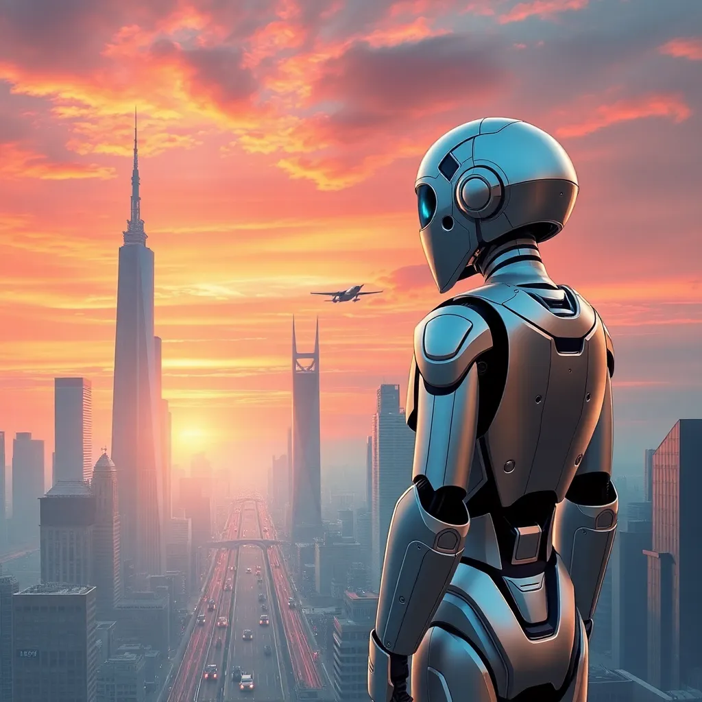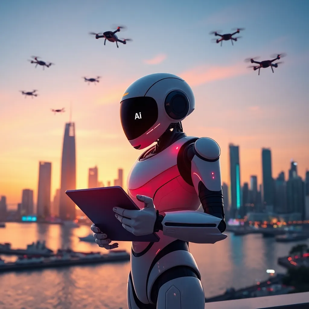 Imagine a futuristic cityscape at sunset, with sleek skyscrapers and neon lights reflecting off the water. In the foreground, a humanoid robot stands proudly, holding a tablet with a glowing AI interface. The city's skyline is dotted with flying drones and hovering taxis, showcasing humanity's harmony with technology.