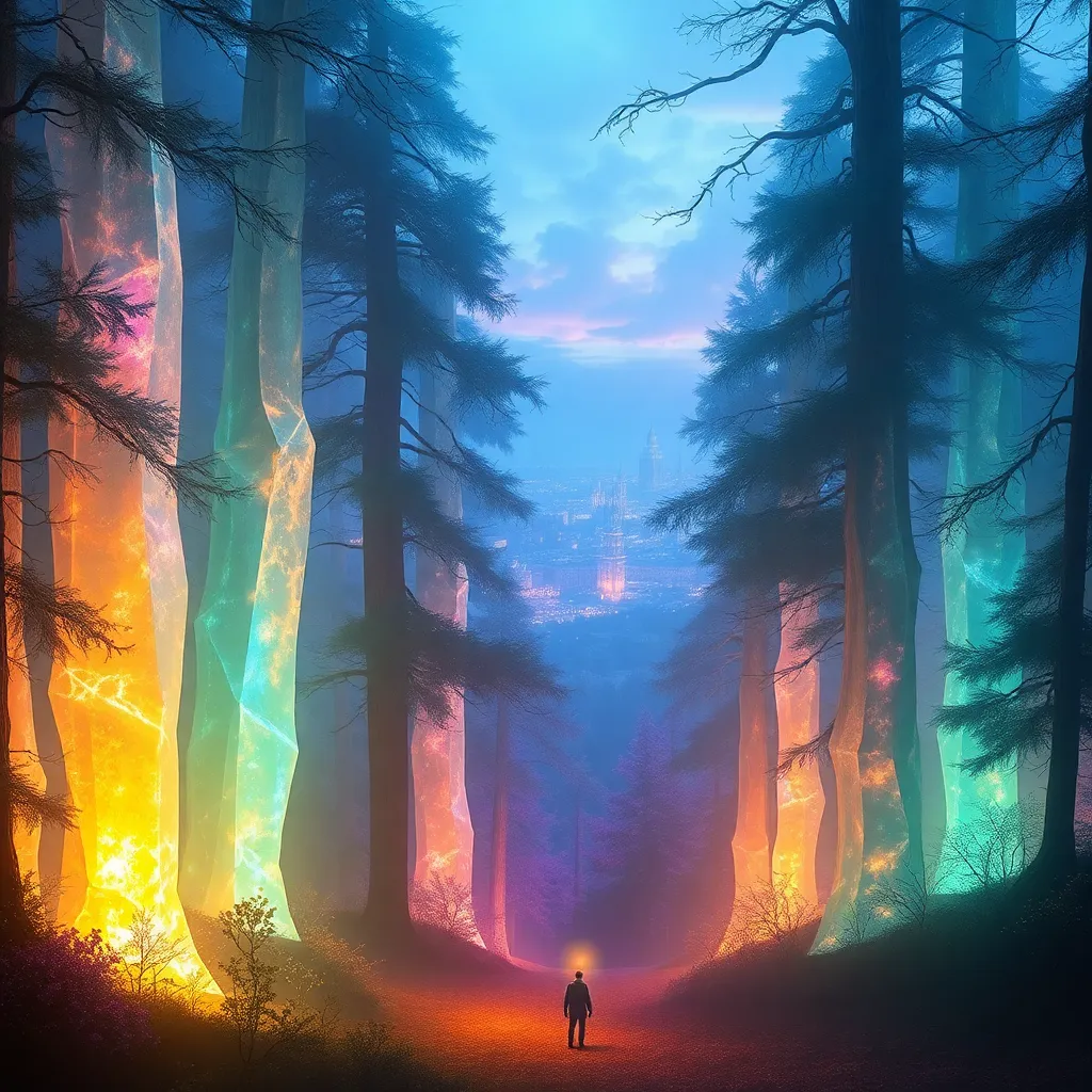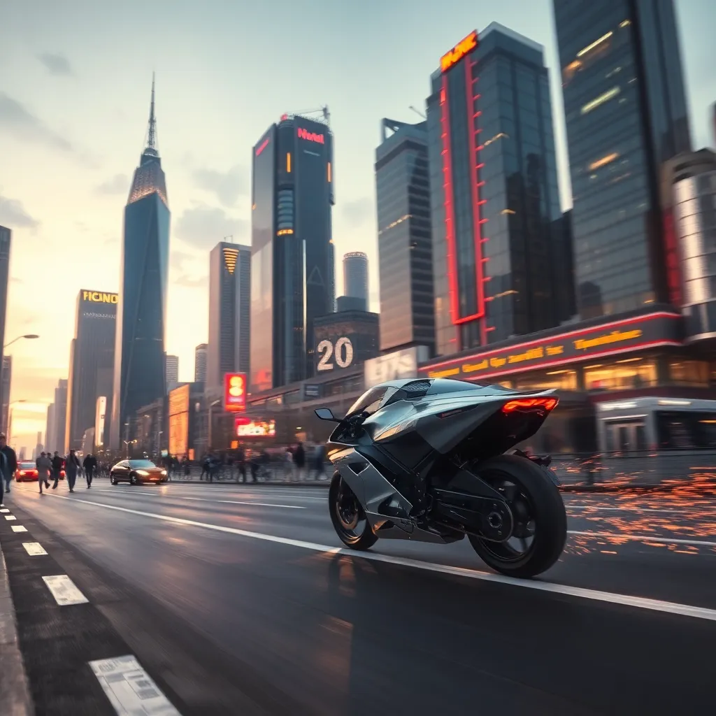 Imagine a futuristic cityscape at dusk, with towering skyscrapers and neon lights reflecting off the wet pavement. In the foreground, a sleek, silver hoverbike zooms by, leaving a trail of sparks. The city's inhabitants, humans and AI beings, go about their daily lives, blending technology and nature in harmony.