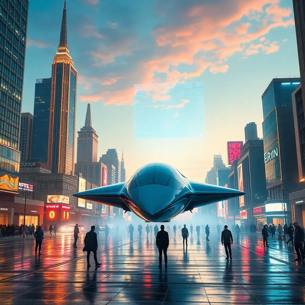 Imagine a futuristic cityscape at dusk, with towering skyscrapers and holographic advertisements glowing in the misty atmosphere. A sleek, silver spaceship lands softly in the center of the city, emitting a gentle hum as it descends. The scene is bathed in a warm, golden light, with the city's inhabitants going about their evening routines.