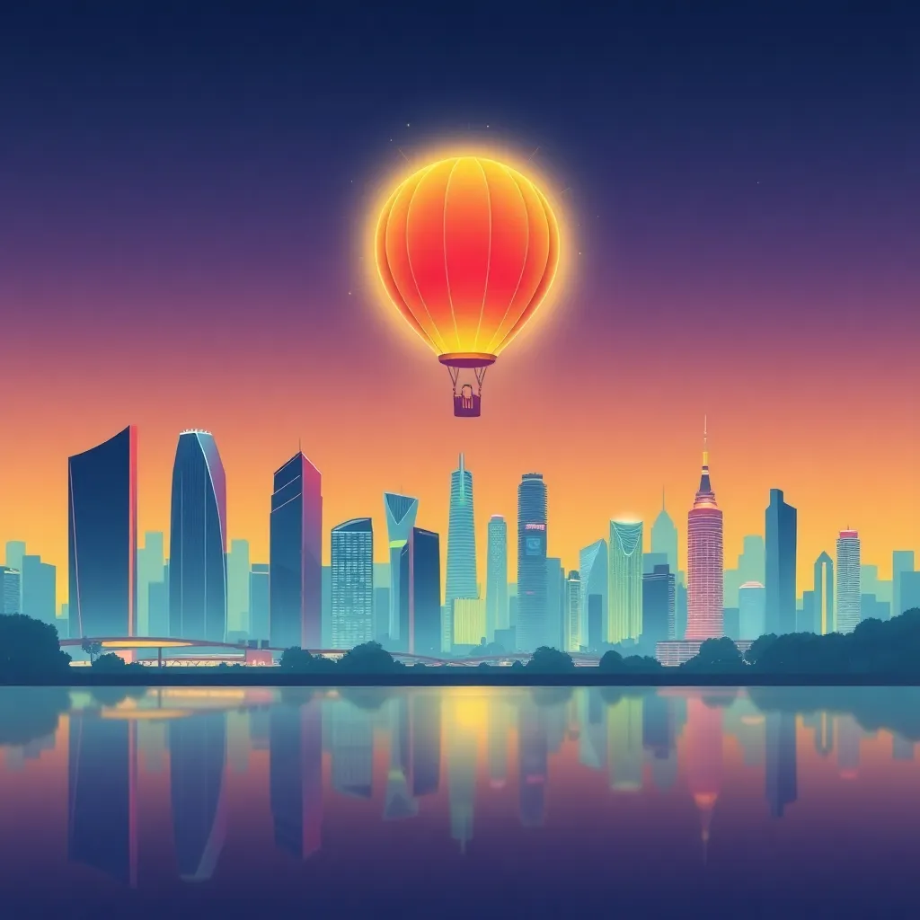 Create an illustration of a futuristic cityscape at dusk, with sleek skyscrapers and neon lights reflecting off a tranquil lake. Incorporate a hot air balloon floating above the city, surrounded by a halo of light, symbolizing innovation and progress. Use vibrant colors and stylized lines to bring the scene to life.