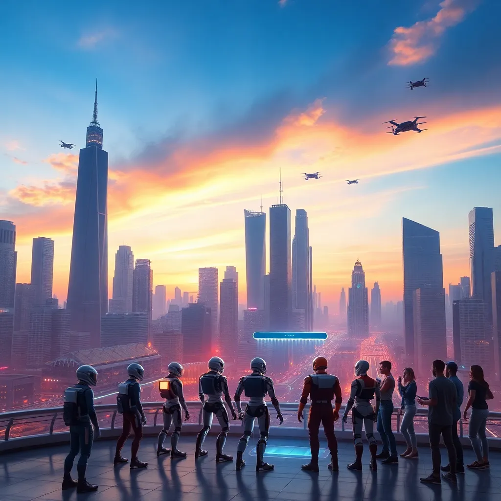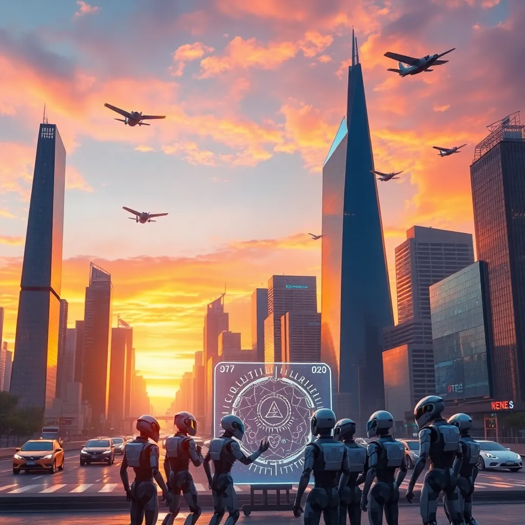 Imagine a futuristic cityscape at sunset, with sleek skyscrapers and flying cars zipping by. In the foreground, a group of robots and humans are gathered around a holographic display, celebrating the launch of a new AI-powered innovation. The sky is painted with vibrant hues of orange, pink, and purple.