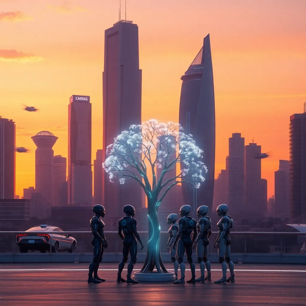 Imagine a futuristic cityscape at sunset, with towering skyscrapers and sleek flying cars zipping by. The sky is painted with hues of orange, pink, and purple. In the foreground, a group of robots of different shapes and sizes are gathered around a glowing, holographic tree, symbolizing innovation and harmony.