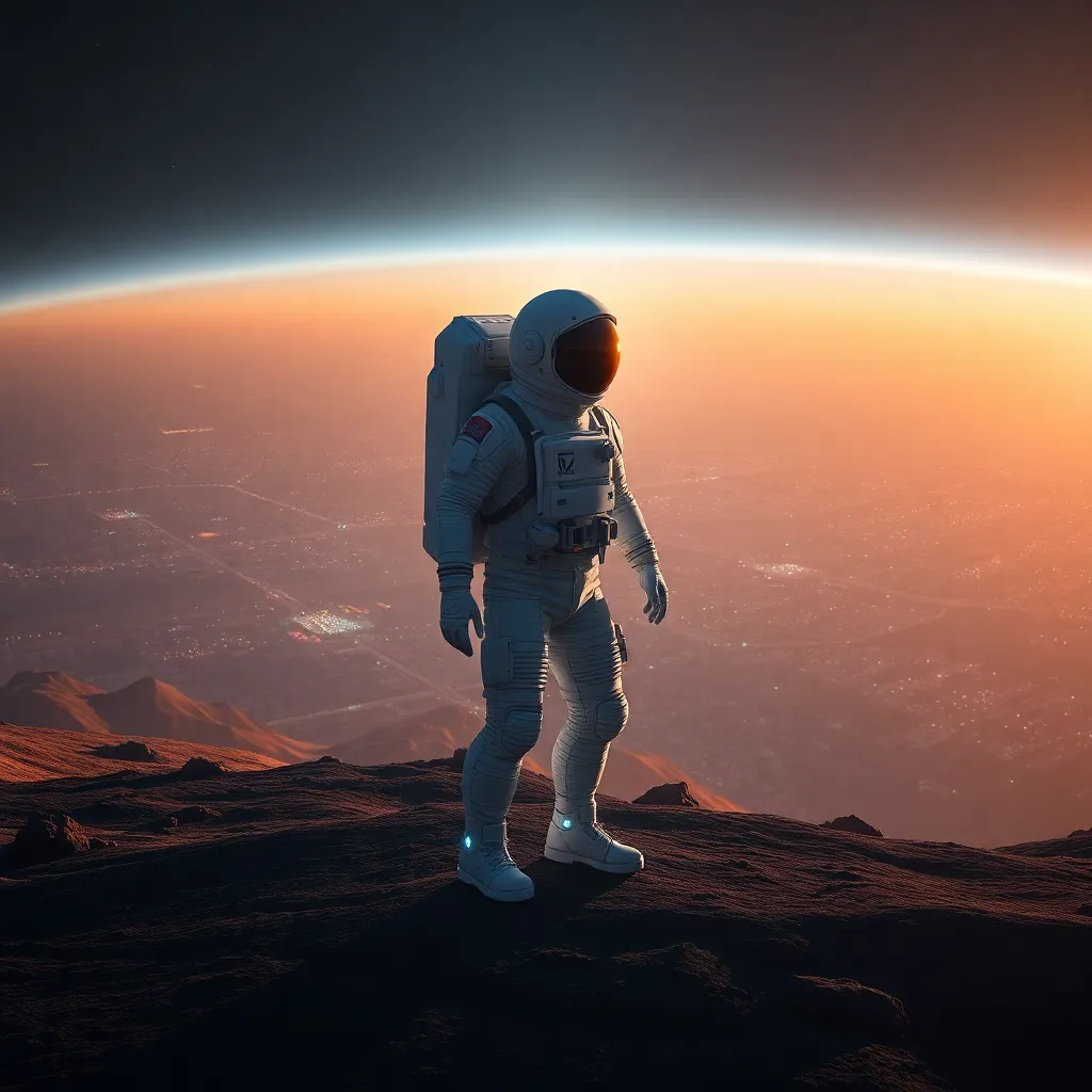 Create an AI-generated image for the 'Future of Space Exploration' section of the AI Yearbook. Depict a futuristic astronaut standing on the surface of a distant planet, surrounded by a halo of light and a sprawling cityscape in the background. Incorporate subtle hints of AI-generated details, such as glowing circuits and micro-transceivers.