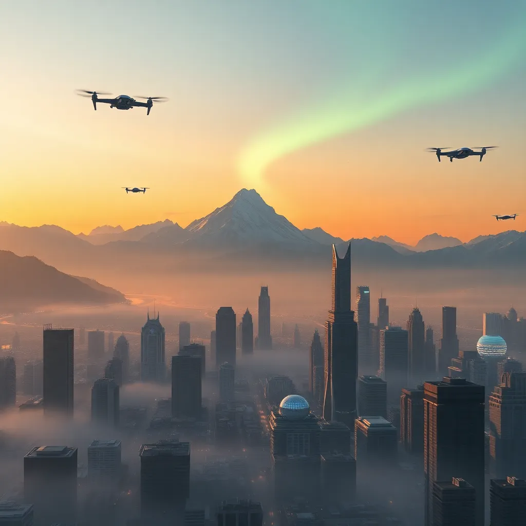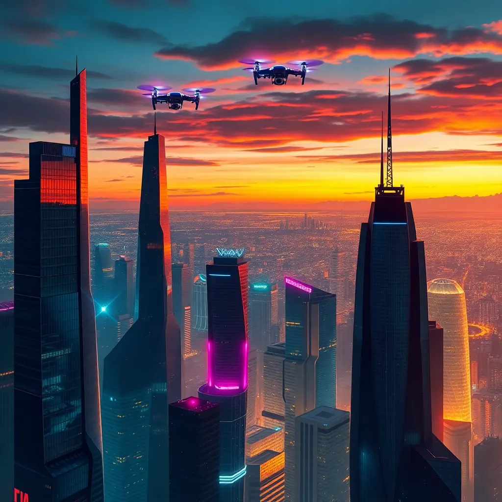 Create a futuristic cityscape at sunset, with sleek skyscrapers, hovering drones, and a sprawling metropolis in the distance. Incorporate neon lights, wispy clouds, and a sense of movement and energy. Use vibrant colors and bold lines to capture the excitement and innovation of a world driven by technology.