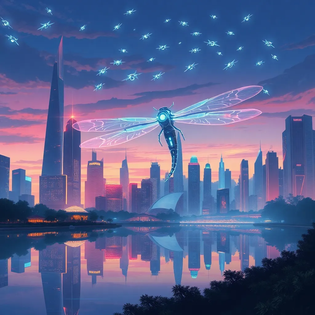 Create an illustration of a futuristic cityscape at dusk, with towering skyscrapers and neon lights reflecting off a calm lake. Incorporate a giant robotic dragonfly hovering above the city, surrounded by a swarm of smaller, glowing drones. The atmosphere should be vibrant and dynamic, with a hint of magic.